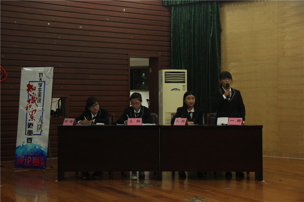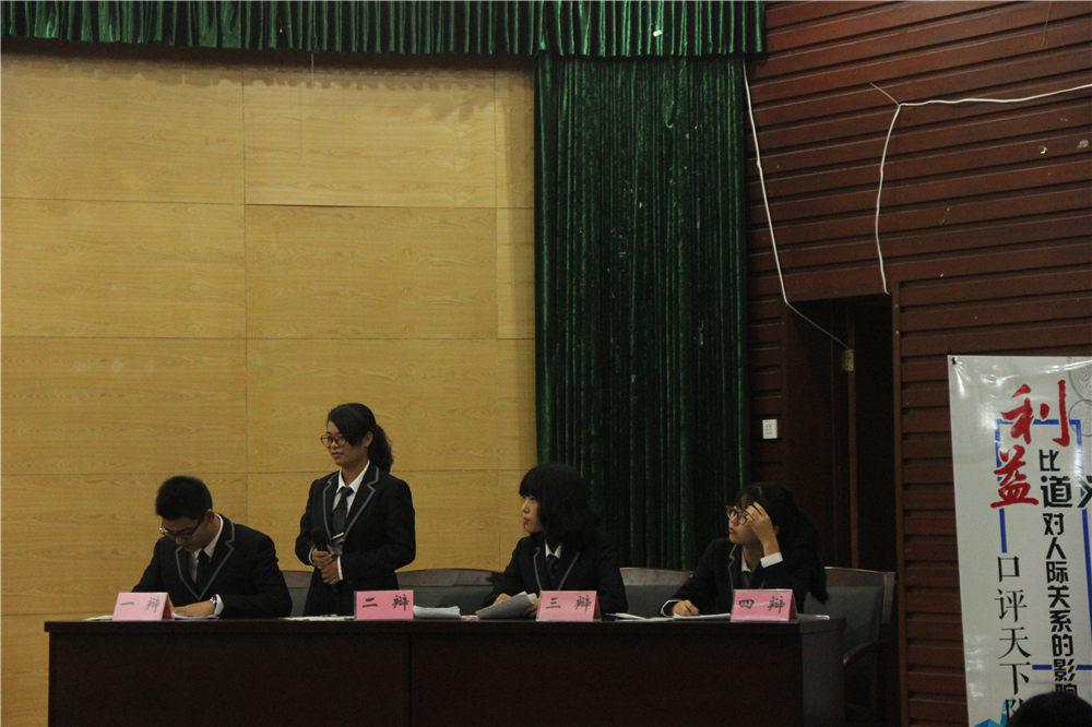 首先开始的是季军争夺赛,正方是来自A16物流班的“一大队”,反方是来自A16经济班的“枪与玫瑰”。双方就“对大学生来说,知识积累与人格塑造哪个更重要”这一命题展开辩论。正方从知识对大学生的重要性出发,结合相关事例指出“积累知识更重要”。而反方则从人格缺失的危害性出发,指出塑造人格的重要性。双方针锋相对,唇枪舌剑,最终正方更胜一筹。接下来上演的是高潮迭起的冠军争夺战,正方A16物流班的“进击队”和反方A16财务2班的“口评天下”围绕“道义还是利益对人际关系的影响更大”这一命题开展辩论。正方从道义的定义和相关事例出发来论证,而反方则从人们对利益的看重以及精神利益两方面指出利益在人际关系中的影响之大。双方利用犀利的言辞咄咄紧逼,不时引得观众掌声阵阵。