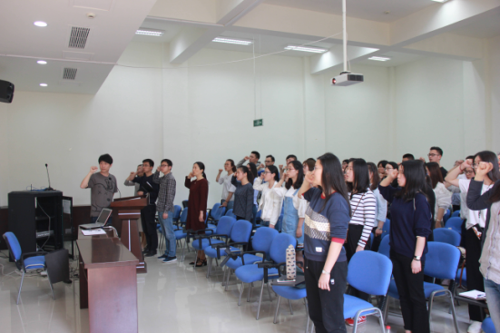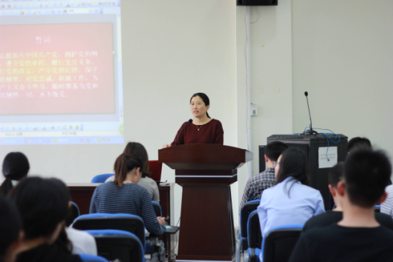 大会在激昂的国际歌声中拉开序幕,与会党员庄严地举起右手,共同重温入党誓词,表达了为共产主义事业奋斗终身的理想和信念。随后,党委副书记应军老师上台发言,回忆了至今仍历历在目的13级新生入学军训时的点点滴滴,流露出了对他们的深切情感,也表达了对13级毕业生的赞赏并对他们所做出的成绩表示高度肯定,并鼓励他们走上工作岗位后,继续以党员的标准严格要求自己,为党旗增辉,为母校增光。