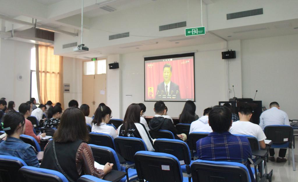 10月18日上午9点,黄色网站 组织院党员、入党积极分子在文理楼观看十九大开幕式。出席的老师有经管学院院长、党委副书记全永波老师、党委副书记应军老师、学工办主任徐幼文老师、团委书记吕君老师、辅导员应巧燕老师以及邬云鹏老师。