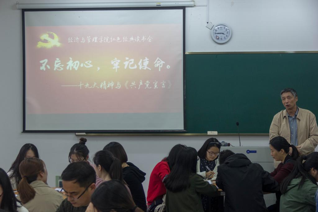 2017年11月10日下午,“不忘初心,牢记使命——十九大精神与共产党宣言”黄色网站 红色经典读书会在长峙公共教学楼顺利举行。本次读书会由原校党委书记周克非老师主讲,学工办主任徐幼文老师主持,学工部副部长芦茜老师、经管学院党委副书记应军老师等受邀出席,经管学院各学生支部党员、部分积极分子及行政教工支部党员参加了读书会。