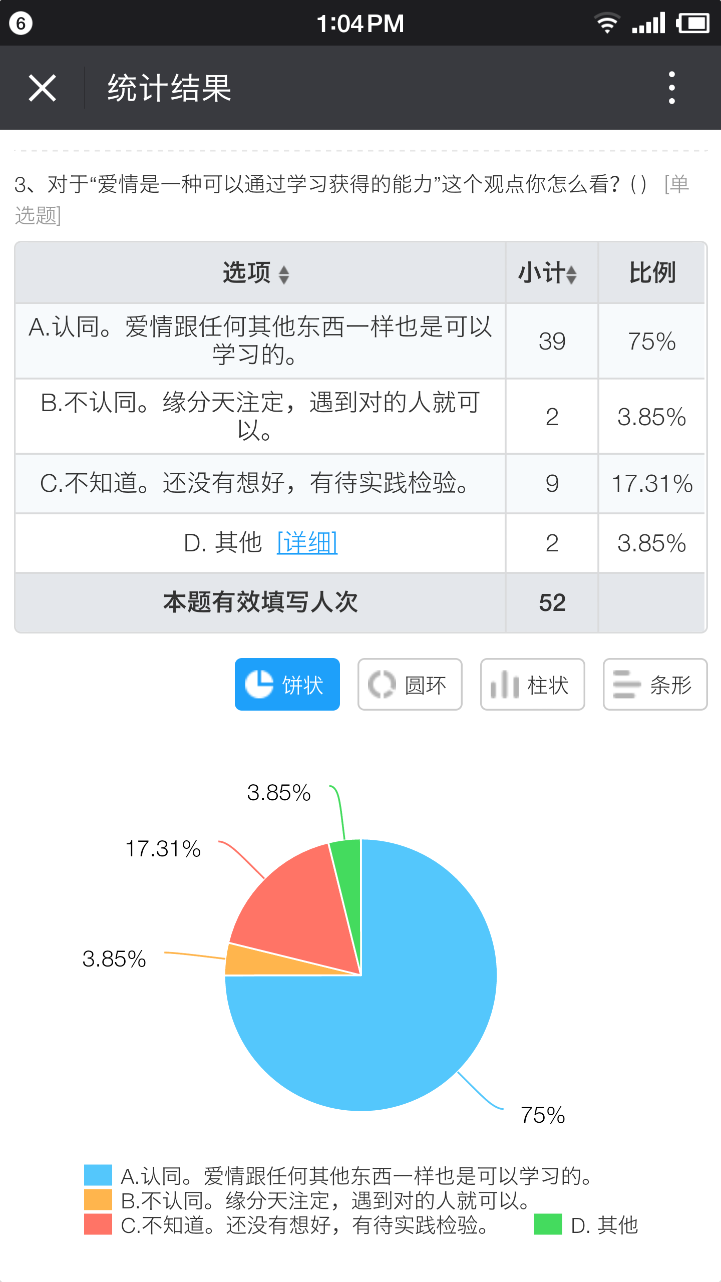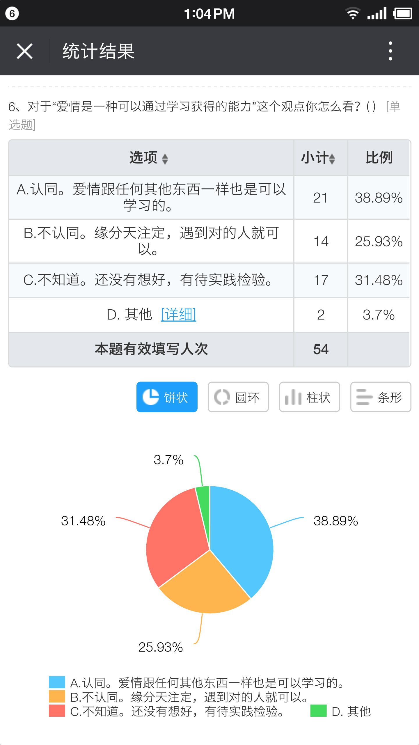 在“爱情是否是一种可以通过学习获得的能力”这一课程核心问题上,课前和课后问卷对比图。
