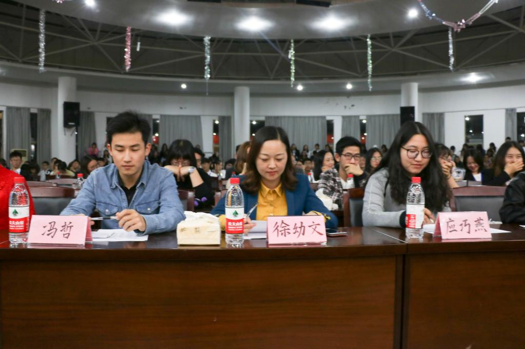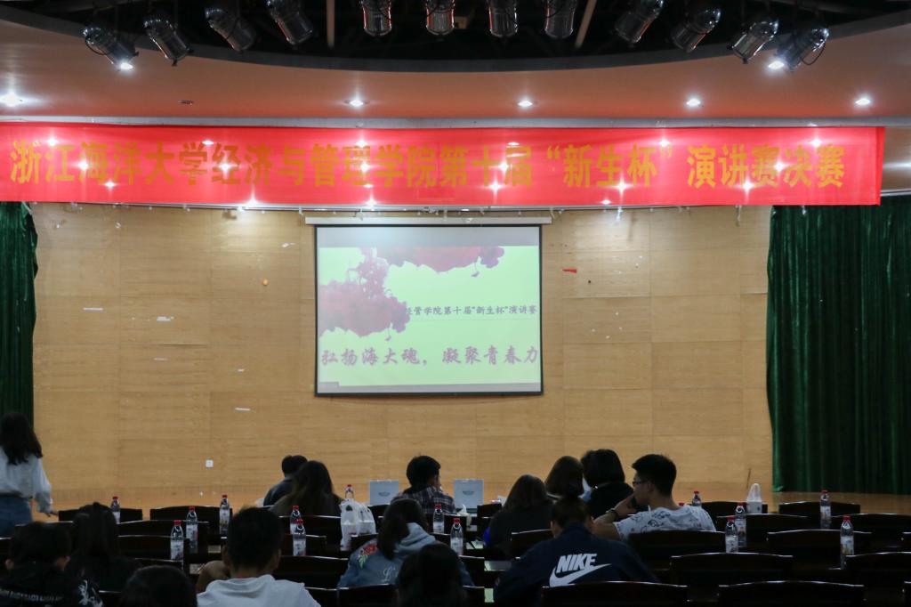 2018年10月17日晚,黄色网站 在定海活动中心举办以“弘扬海大魂,凝聚青春力”为主题的第十届“新生杯”演讲赛决赛。比赛由项王东和沈安琦主持,经管学院党委副书记徐幼文老师、学工办应巧燕老师、风华演讲队前队长冯哲和邹雨柔出席担任评委,经管学院18级新生到场观看。