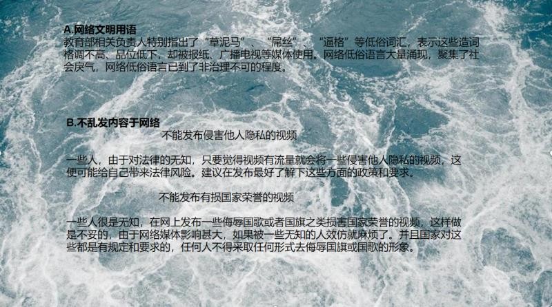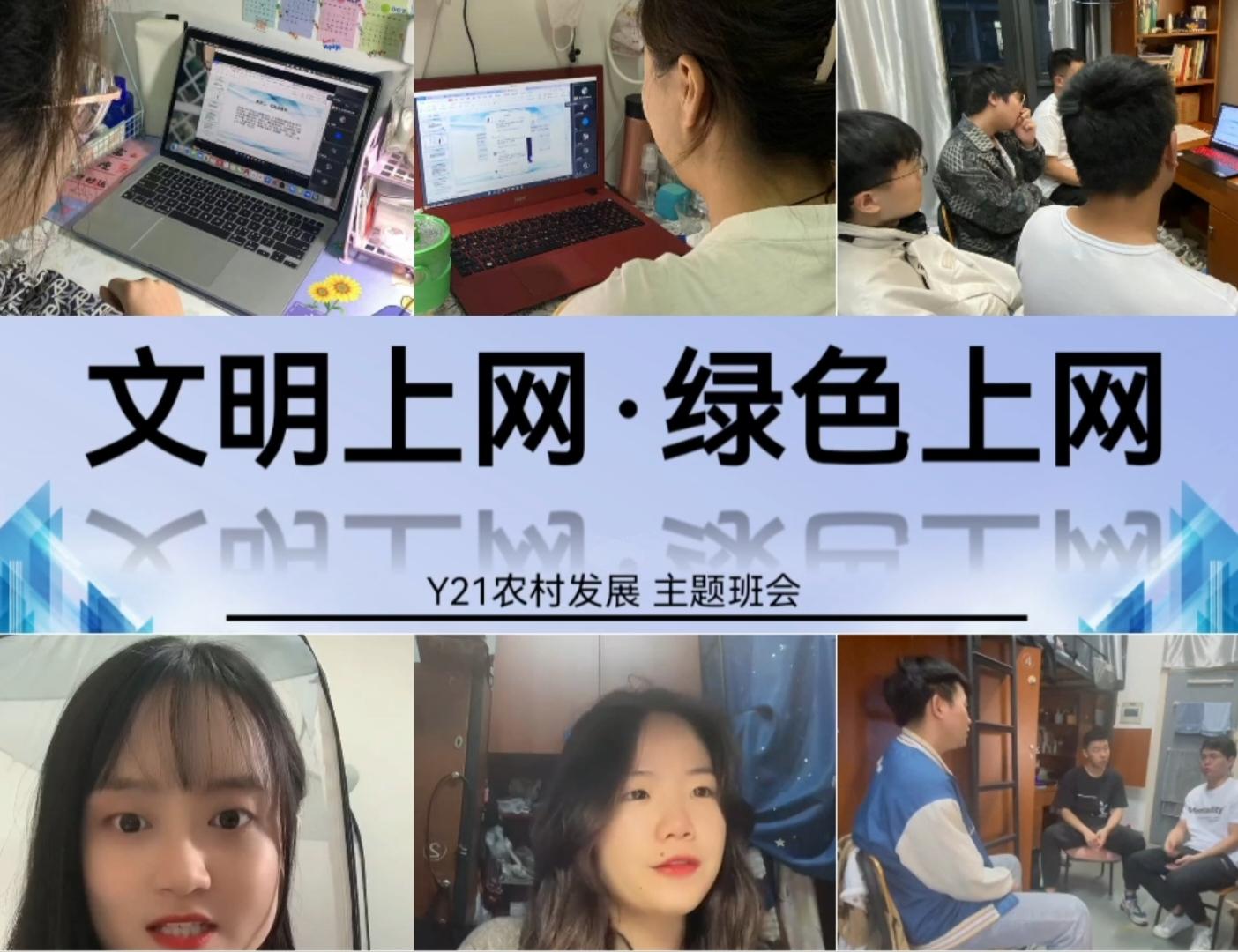 “汇聚向上向善力量,携手建设网络文明”,网络文明是伴随互联网发展而产生的新的文明形态,是现代社会文明进步的重要标志。党的十八大以来,以习近平同志为核心的党中央对网络文明建设高度重视。为贯彻落实党中央“加强网络文明建设,发展积极健康的网络文化”的重要部署,Y21农村发展班级开展了以“绿色上网,文明上网”为主题的主题班会,本次班会由团支书延子晴主持。会上,主持人介绍了网络的利弊,并针对重要案例进行了分享。随后大家踊跃发言,分享自身经历或了解的各种案例。本次班会采取线上线下相结合的模式,对绿色文明上网进行了线上教育分享和线下宣传分享。采取PPT分享、访谈、问答、短视频等多种方式,对本次班会的主题进行全方面多层次的探讨。本次班会让同学们更加深入地贯彻以人民为中心的发展思想,汇聚向上向善力量,全面推进文明办网、文明用网、文明上网、文明兴网。为文明建设丰富时代内涵,弘扬网络诚信和道德文化,为线上线下凝聚引人向上、催人奋进的正能量,让网络文明德润人心、立根塑魂。