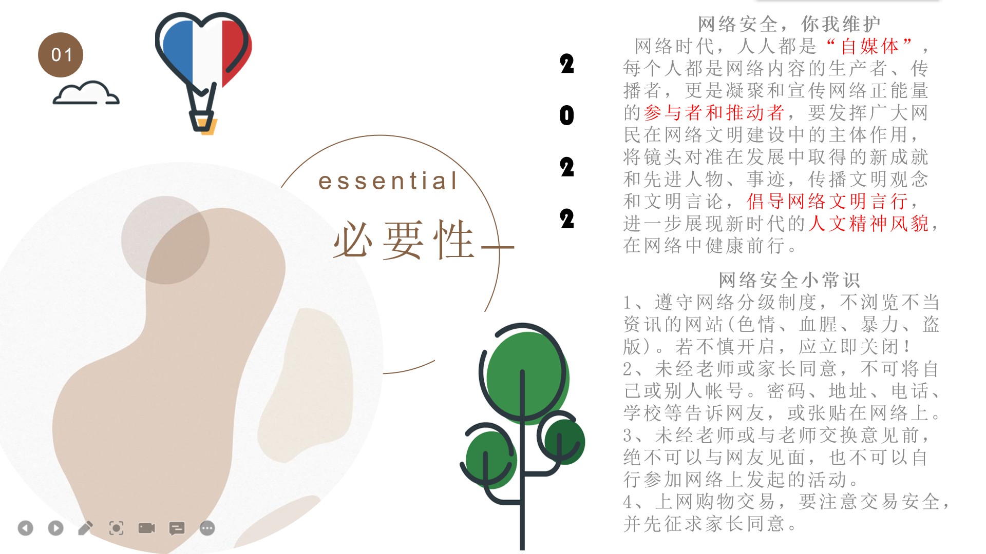 文明上网、你我同行。此次班会简要介绍了什么是校园网络安全、网络安全隐患四种常见情况、如何抵制网络安全隐患、青少年应如何担起责任和《关于加强网络文明建设的意见》。作为新时代的青年,我们更应当肩负起社会责任,自觉传播中华文明,弘扬和培养社会主义核心价值观,为实现中华民族伟大复兴的中国梦而不懈奋斗!