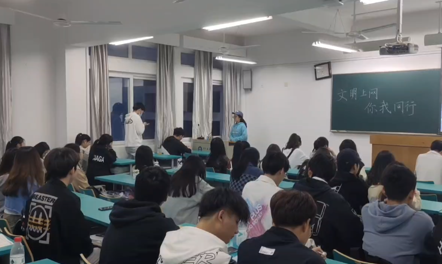 “建设安全的网络环境,打造清朗的网络空间,人人有责,人人参与”。团支书罗天韵同学从习近平总书记的网络强国思想展开班会主题,介绍了当代互联网的现状以及目前网络上出现的一系列乱象。接着,放映了一个关于文明素质微课堂的视频,让同学们开启了十几分钟的小组讨论,讨论结束后每个小组派代表上台发言,发言内容主要包括个人使用互联网的时长,对某种特定网络行为的喜爱与反感程度以及对互联网乱象整治的建议。发言结束,班会也接近尾声,罗天韵同学最后邀请班级代表宣读了“网络文明志愿者倡议书”,鼓励同学们依法上网,理性上网。本次班会,让新时代青年更加了解文明上网的重要性,更加牢记中国共产党的初心与使命,坚定了同学们争做网络文明使者的信念,增强了网络道德文明意识。