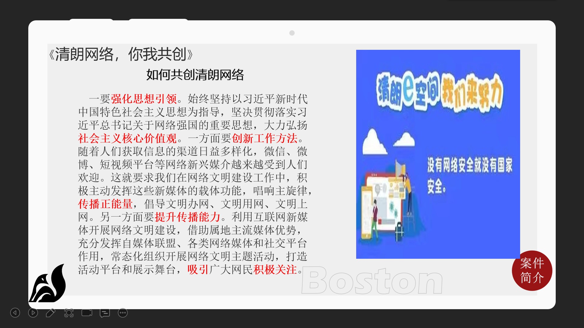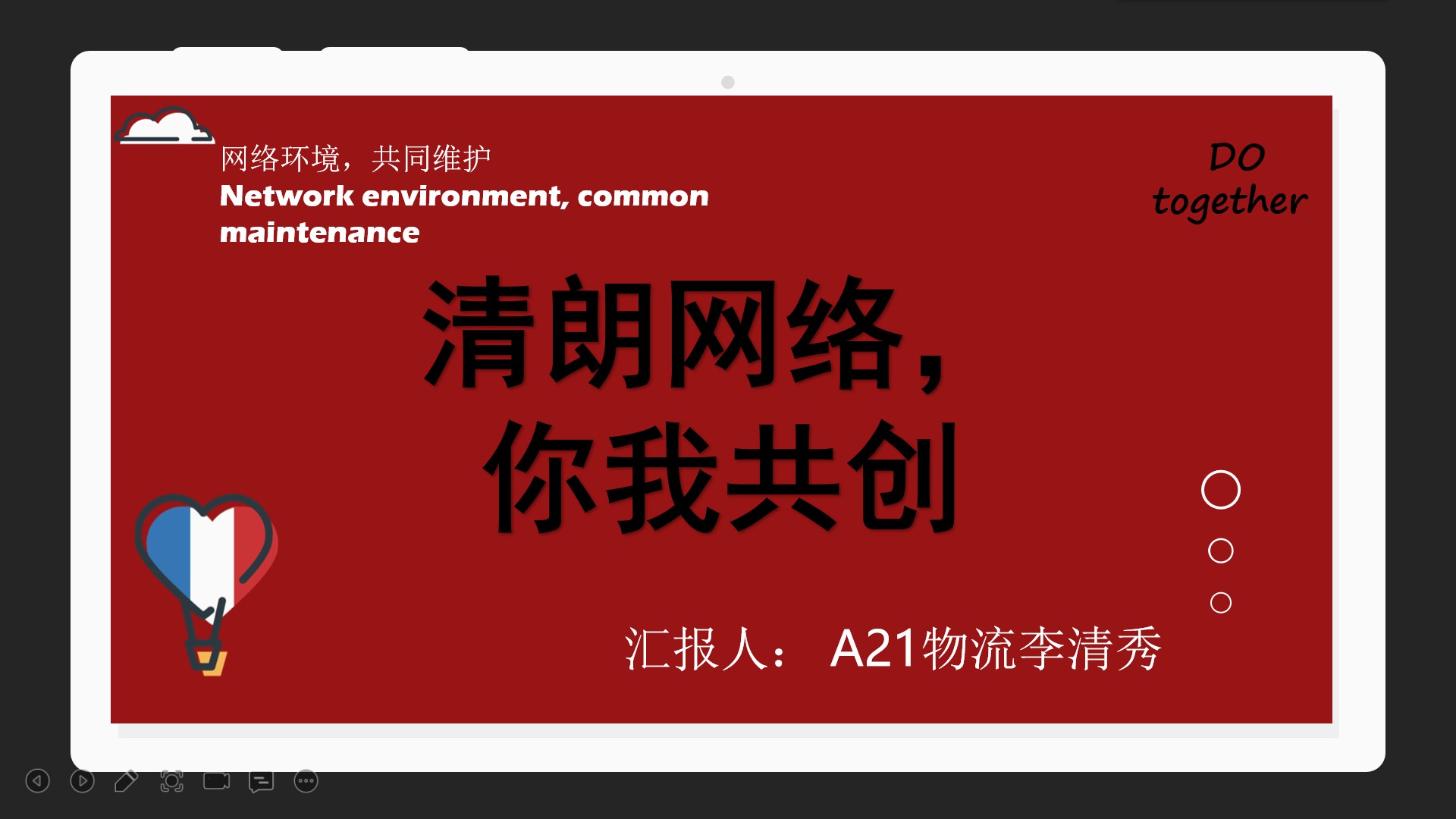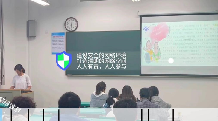 李清秀同学为我们带来了网络文明微课《清朗网络,你我共创》,李清秀同学讲述了建设干净、清朗、和谐的网络空间的必要性以及如何守好“互联网之法”。呼吁全体同学践行社会主义核心价值观,共同营造积极向上、健康文明的网络环境;依法上网,作为主力军促进清朗网络的建设。