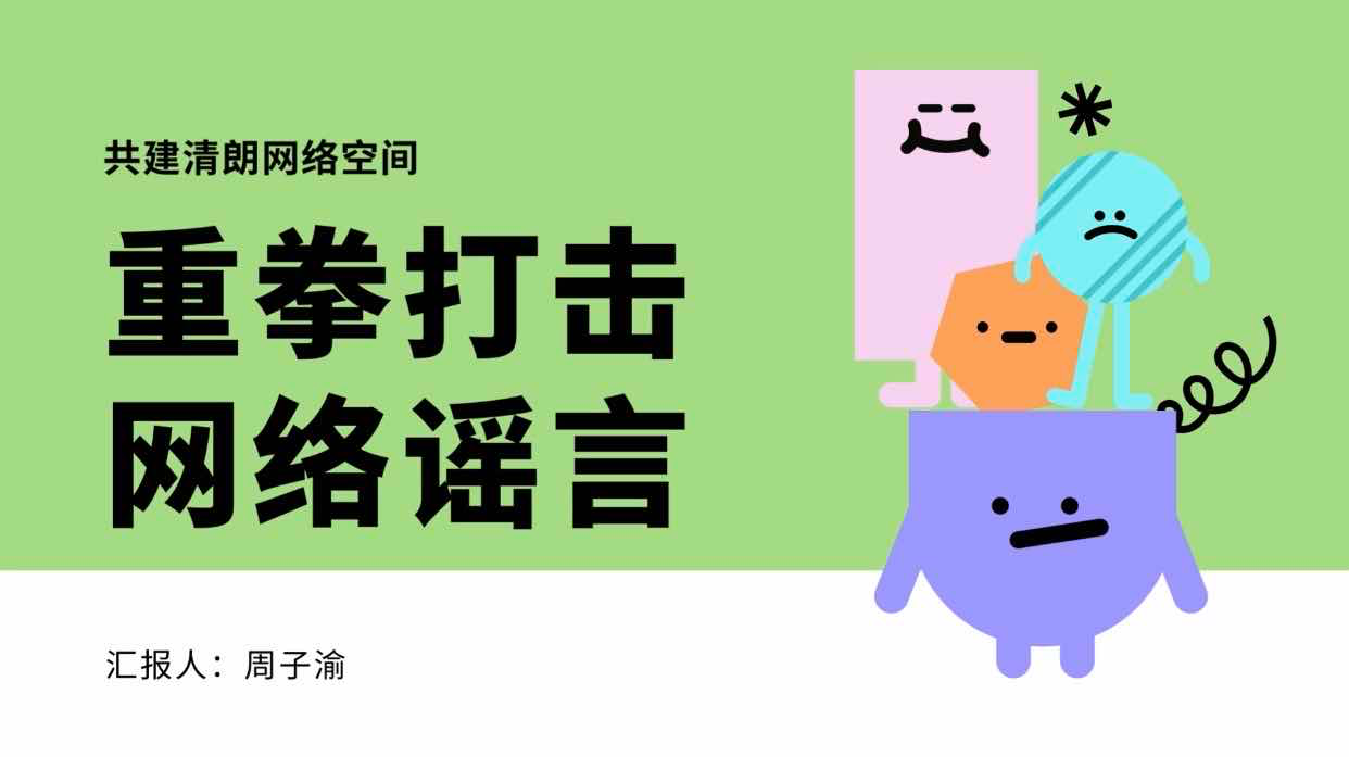 周子渝同学为我们带来了网络文明微课《重拳打击网络谣言,共建清朗网络空间》,周子渝同学为我们讲述了目前通过网络发布、传播的各种虚假信息或谣言,继而由网络不文明现象引出疫情大背景,介绍了疫情当下无中生有借“疫”博眼球的各类行为,不仅造成网民恐慌,而且影响疫情防控,想要告诉大家网络空间不是法外之地,呼吁同学们要提高警惕,树立法治意识,增强辨别能力,自觉遵守法律法规,以实际行动共同维护健康有序的网络环境和社会秩序。