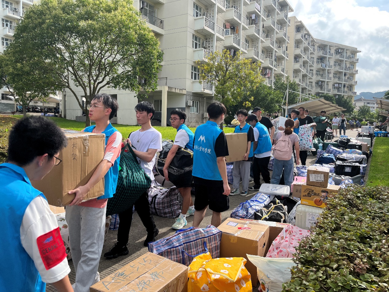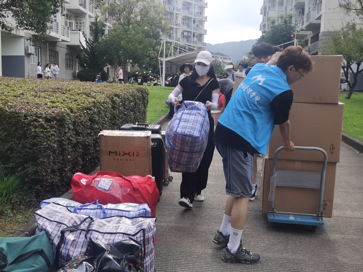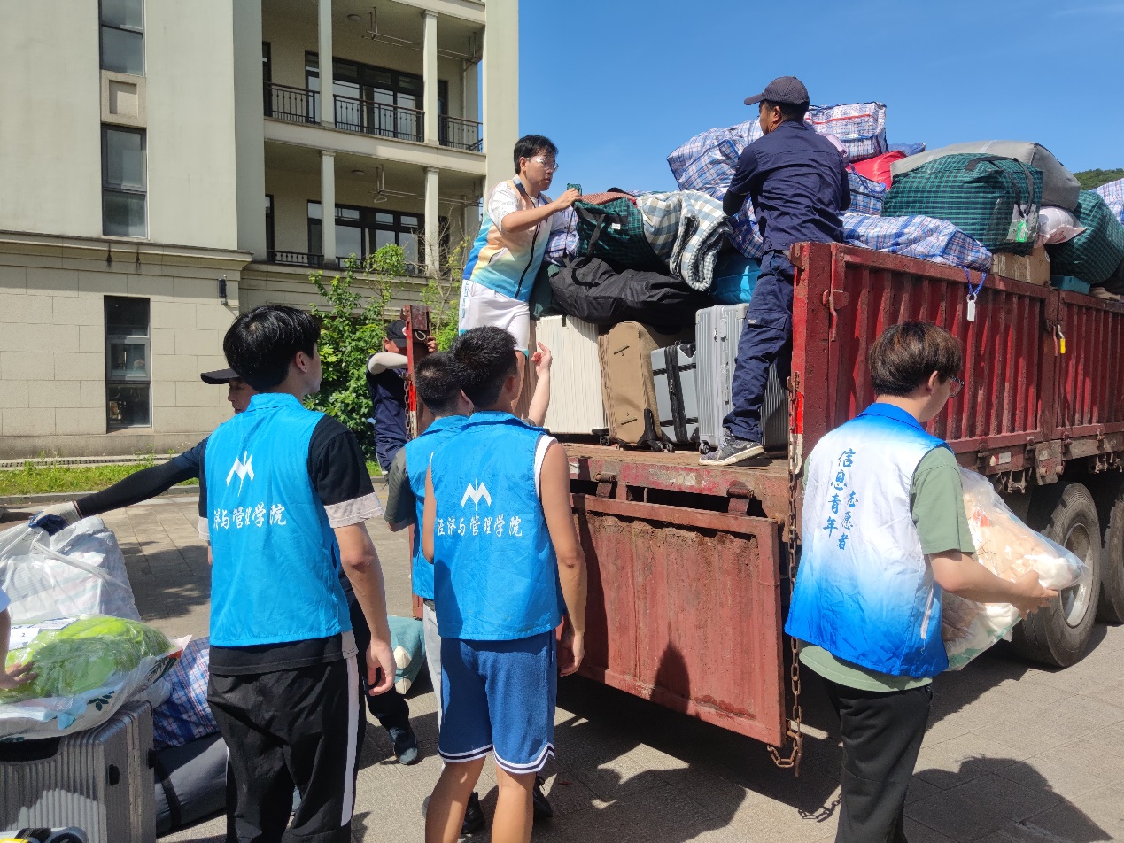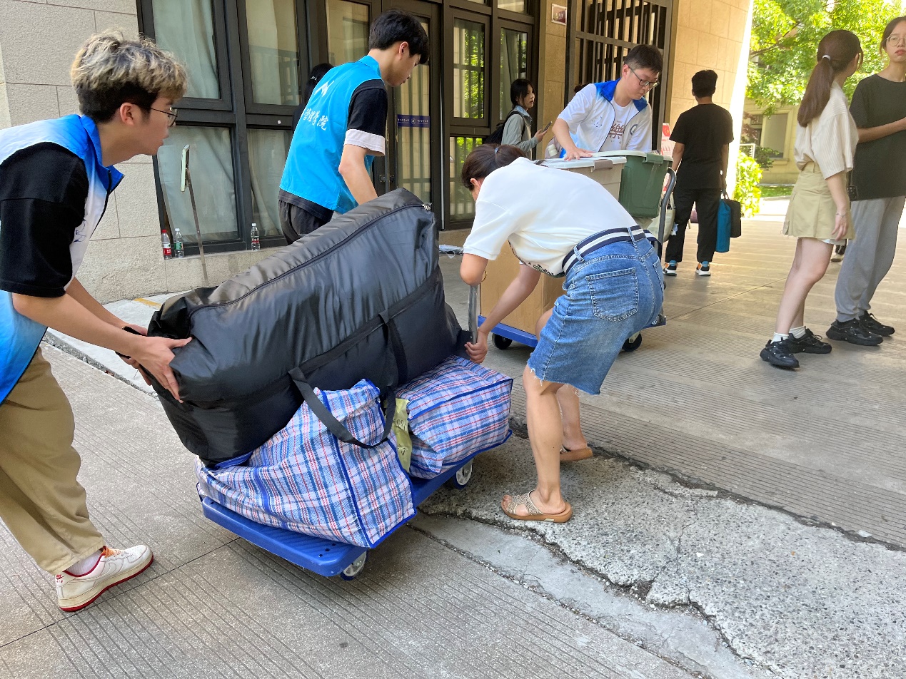 2021级的同学们在学院统一安排和部署下,依次有序地将行李摆放在定海校区指定点位,等待搬运货车到位后集中装车。为确保学生行李的运输安全,每一辆搬运车辆都安排了一位跟车同学。上午8时,第一辆装满行李的搬运货车从定海校区发往新城校区。在两个校区间,学院领导和老师们始终奋战在一线,现场沟通协调、指挥调度,及时处理同学们在搬迁过程中遇到的各种困难;来自各学院的学生志愿者们积极帮助同学们搬运行李、维持秩序、记录车次,切实为搬迁工作排忧解难。炎炎烈日下,尽管汗水早已打湿了衣裳,但是志愿者们坚守岗位、不辞辛劳、废寝忘食,用汗水诠释了“奉献、友爱、互助、进步”的志愿服务精神。上午11时,最后一辆搬运车辆从定海校区出发;下午13点,最后一件行李被搬运至G幢学生宿舍,历时6个小时的寝室搬迁工作在安全、平稳、有序中圆满结束。搬迁工作结束后,徐幼文副书记还带领学院学工队伍走访了学生寝室,老师们鼓励同学要尽早适应新校区新寝室的环境,养成良好的学习生活习惯,自觉遵守宿舍管理规定,以饱满的姿态、崭新的面貌迎接军训的考验。