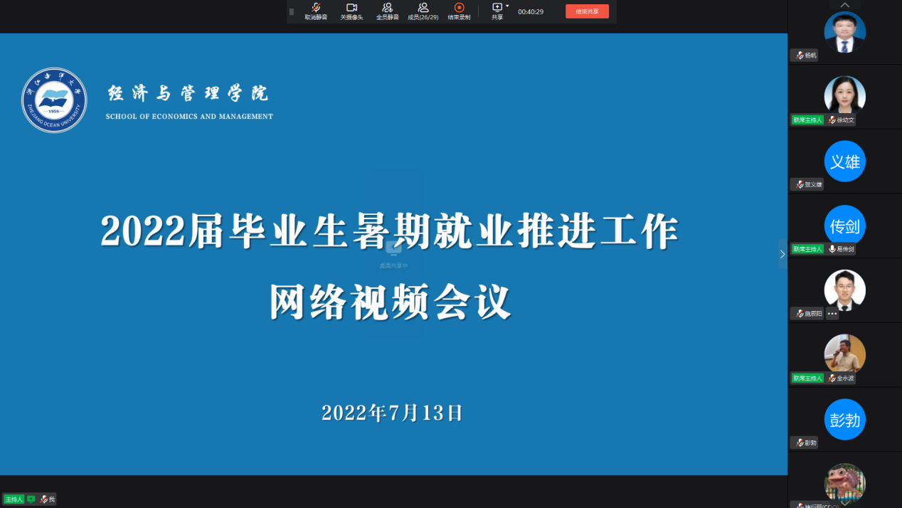 为深入贯彻习近平总书记对毕业生就业工作作出的重要指示批示精神,有效落实全省2022届高校毕业生就业创业工作会议精神和学校党委会专题会议精神,高效推进学院2022届毕业生暑期就业工作。黄色网站 于7月13日召开了2022届毕业生暑期就业推进工作会议。学院党政领导班子、毕业班班主任、系主任、教工和学生党支部书记通过钉钉平台线上参与会议。本次会议由学院党委副书记、纪委书记徐幼文主持。