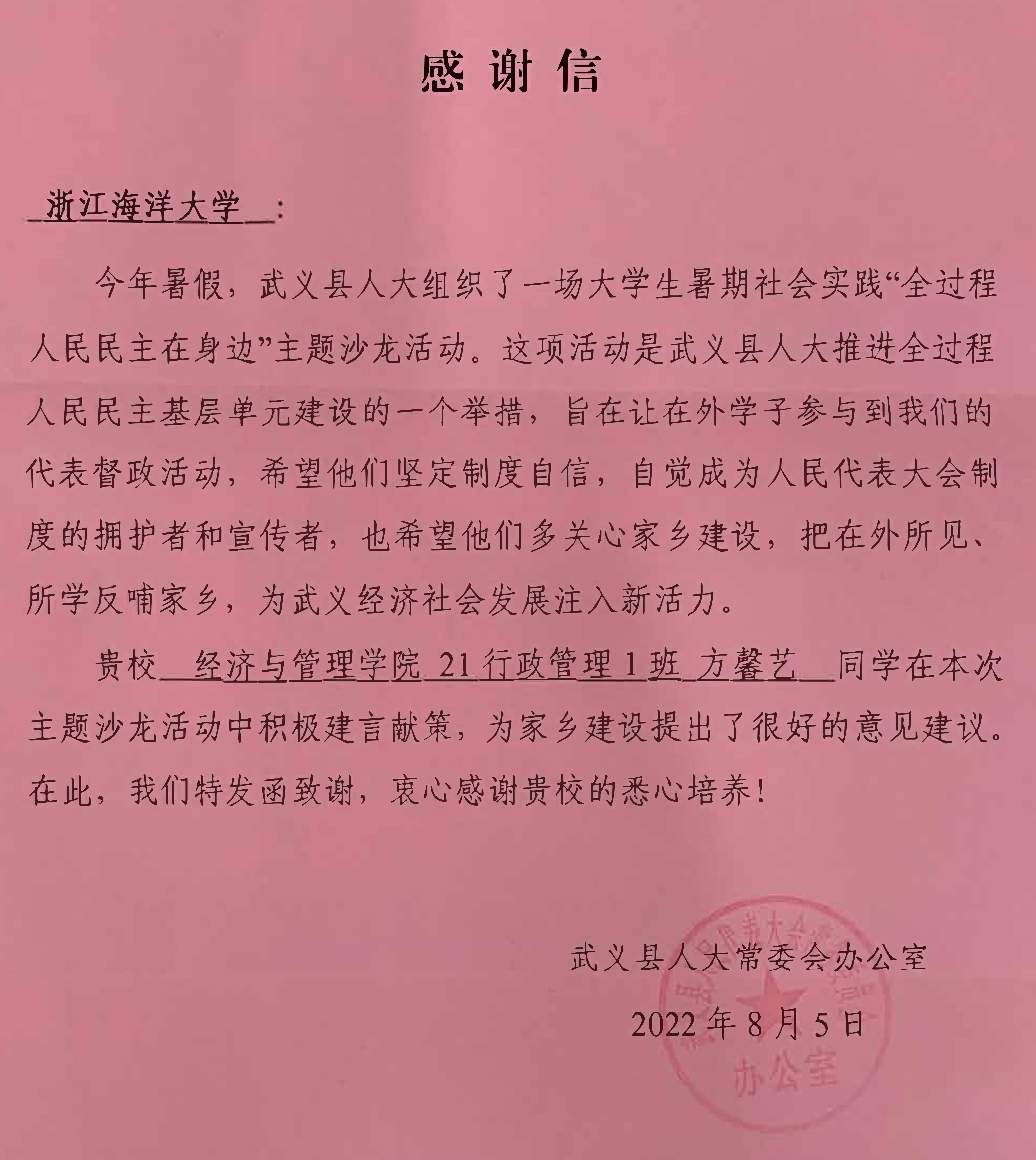 今年暑假,武义县人大组织了一场大学生暑期社会实践“全过程人民民主在身边”主题沙龙活动。这项活动是武义县人大推进全过程人民民主基层单元建设的一个举措,旨在让在外学子参与到我们的代表督政活动,希望他们坚定制度自信,自觉成为人民代表大会制度的拥护者和宣传者,也希望他们多关心家乡建设,把在外所见、所学反哺家乡,为武义经济社会发展注入新活力。