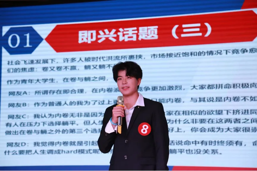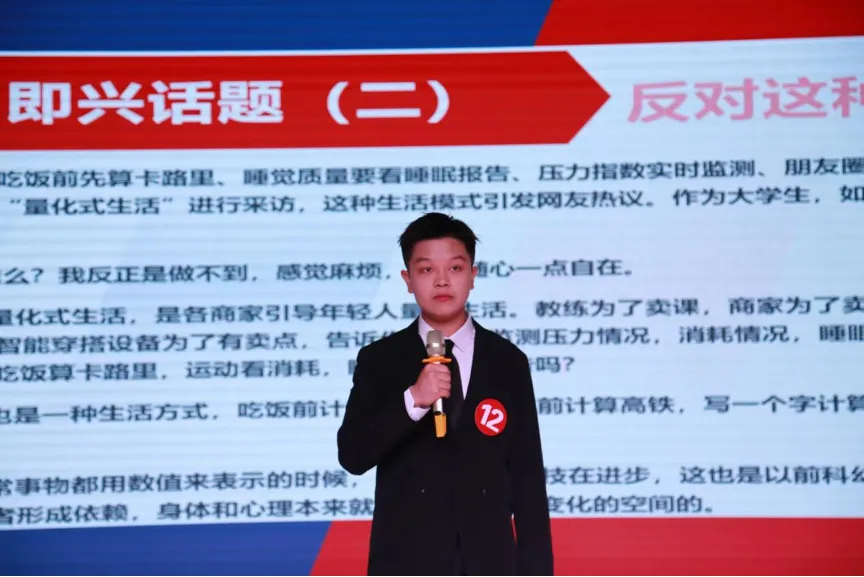 第二轮比赛为争夺赛,比赛采取即兴演讲的形式。晋级的六位选手一同上台抽选题目并自动组成正反小组。即兴演讲一方面锻炼了选手们的思辨能力,另一方面还考验了选手的临场应变能力、审题与评估能力,更激发了同学们的创新思维。尽管即兴演讲题目涉及范围广泛,但选手们均能从容不迫,纷纷结合个人思想、学习和生活实际,以独到的见解进行了深入诠释,充分展现了经管学子深厚的知识储备,不时将现场气氛推向高潮,观众席上掌声雷动。