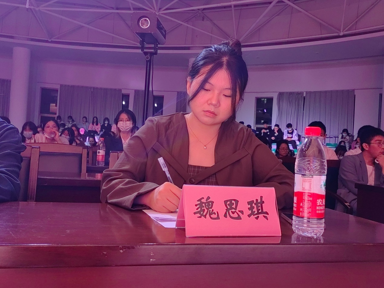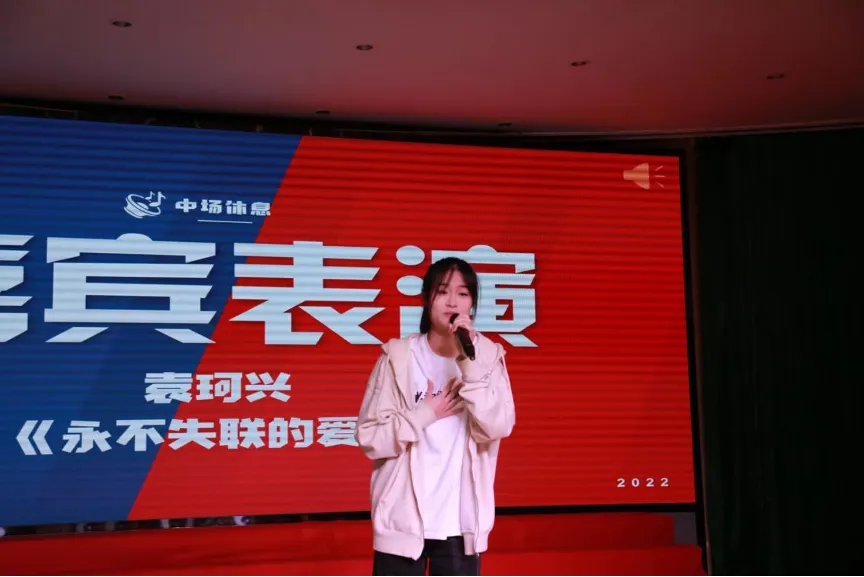 经过一番激烈的比拼,第一环节的比赛也渐入尾声。风华演讲队队长魏思琪同学的点评充分表达了自己的独到见解,魏思琪向选手们指出演讲不仅要有专业基础理论,同时也需要接地气,选手们能用鲜活事例阐明道理、抒发情怀,体现了当代青年的使命担当和立足中国大地,讲好中国故事、传播中国声音的使命感与责任感,这也让选手和观众从中受益匪浅。在等待公布晋级名单的同时,袁柯兴同学为现场的观众带来了精彩的歌曲表演《永不失联的爱》,活跃了比赛的气氛。