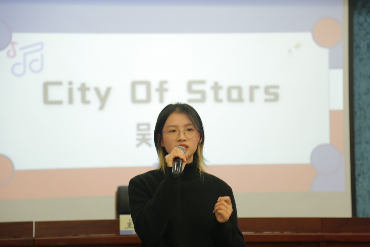 紧张刺激的第一场辩论赛结束后,进入中场休息环节,吴诗怡同学为我们带来了一段独唱《City of stars》,使原本紧张的气氛变得轻松愉快。