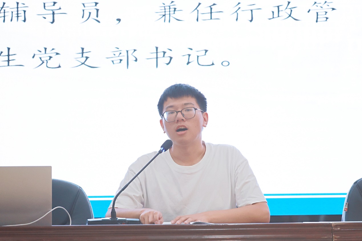 施辰阳老师围绕“团学、信息宣传、校园文化建设”工作,向同学们介绍了学院团组织关系转接事宜、团委学生会的构架、学校第二课堂学分及成绩评定实施办法、学生志愿服务管理办法、学生社团管理办法等,施老师强调了第二课堂成绩在大学生活中的重要地位,呼吁同学们要积极参与文体活动、志愿服务和社会实践等活动,成为德才兼备、全面发展的青年大学生。施老师还为全体同学详细介绍了学校推优入团的完整流程,讲解了入团申请书的书写规范。施老师还呼吁同学们要认真完成“青年大学习”网上团课学习,真正成为关心国家大事、时事政治、党政方针的青年大学生。