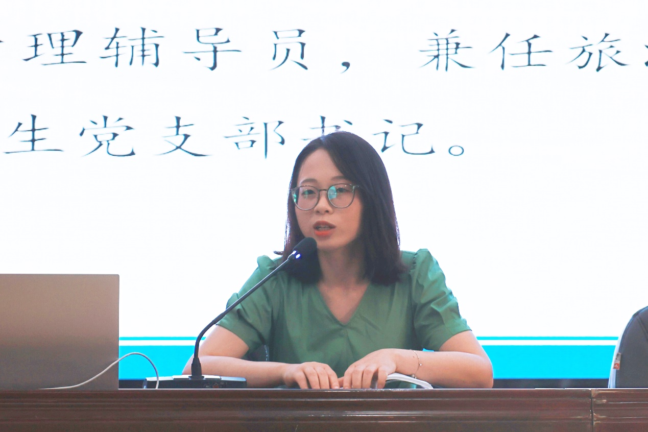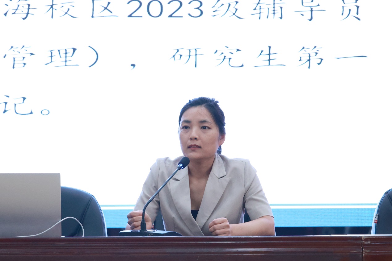 张晏铭老师向大家介绍了大学与高中生活的区别,介绍了宿舍管理、征兵入伍、档案管理等事宜,并希望大家要提前做好大学规划,自律自强,珍惜室友情谊,热爱校园时光,在海大收获不一样的自己。