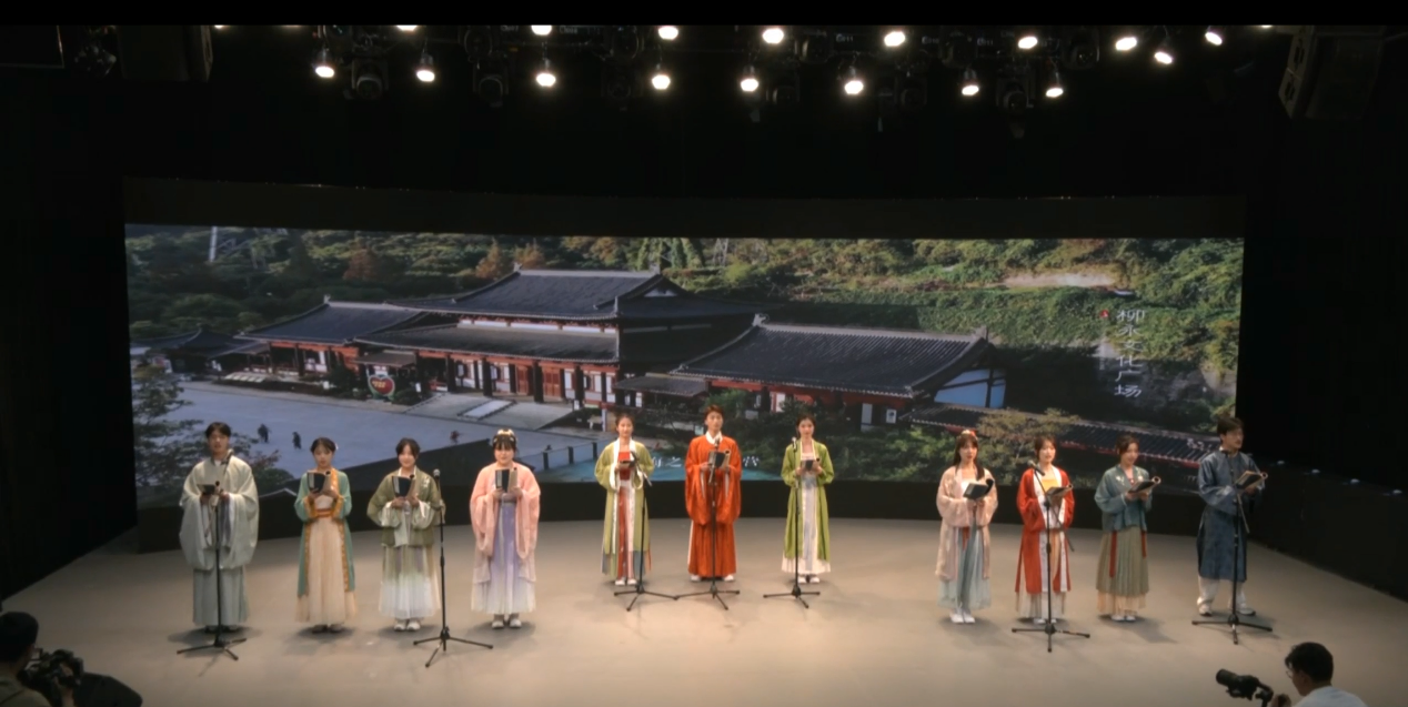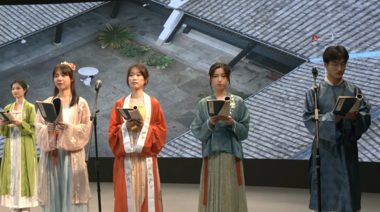 在演播厅内,同学们身着仙气飘逸的汉服,在灯光下闪烁着光芒,每一位都仿佛是从古画中走出的人物。同学们手持卷轴,吟诵着宋代柳永的词作《留客住(林钟商)》。清朗的人声、古筝的旋律和定海古城的视频交织在一起,演绎出穿越时空的美妙乐章,让在场的每一个人都身临其境,感受到那份留别的深情厚意。“此次吟诵是希望能让在场的观众感受到定海古城的独特魅力和历史深度,对于我自身而言,也更深刻地认识了三毛对家乡草木与人情的深厚情感。”来自学院A22财务2班的本科生李明彦这样说道。“舟山不大,定海更像是地图上的一颗图钉,幸运的是,孕育和遇见了三毛。有幸能以这样特别的形式怀念三毛、推介定海,感受三毛的人生态度与生命哲学。”来自学院Y22农发班的研究生李冲这样感慨道。