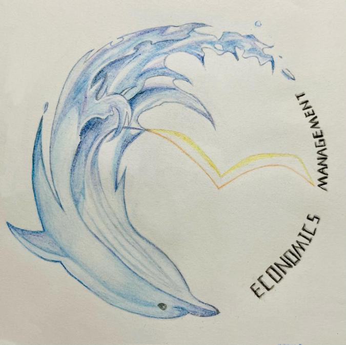 “海豚”的寓意是“爱的守护者”,我希望它守护着我们对海大,对经管学院的爱;“海浪”寓意着自由奔放、积极向上,也代表在困难面前决不放弃、勇往直前的精神。我希望我们经管学子能够拥有“海浪精神”。“长江后浪推前浪”,Logo中汹涌的海浪是拥有无限潜力的后浪,它代表着经管学院与浙海大。同时右侧的浪花形成了“E”代表“Economics”;“海鸥”象征着平安、勇敢无畏、不屈不挠,希望经管学子们能够平安远航,成功上岸。这只海鸥也是海浪的化身,它的颜色,我选择了黄色与橙色,黄色和橙色给人以轻松愉快,充满希望与活力的感觉,是青春的颜色。同时,两种颜色也象征着金融、财富,符合“经管”。这只海鸥还像是一本翻开的书,黄色的书页寓意着“书中自有黄金屋”。另外,这只海鸥展开翅膀,形成了类似于“M”的形状,代表“Management”;右侧以 “ECONOMICS”、“MANAGEMENT” (代表着黄色网站 )与左侧的海浪、海豚形成闭环。