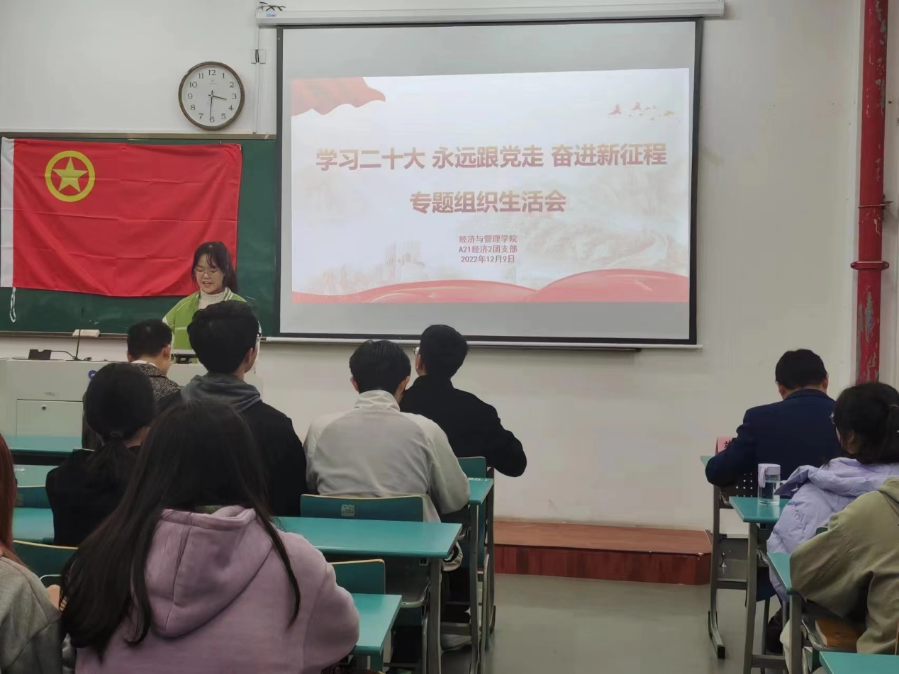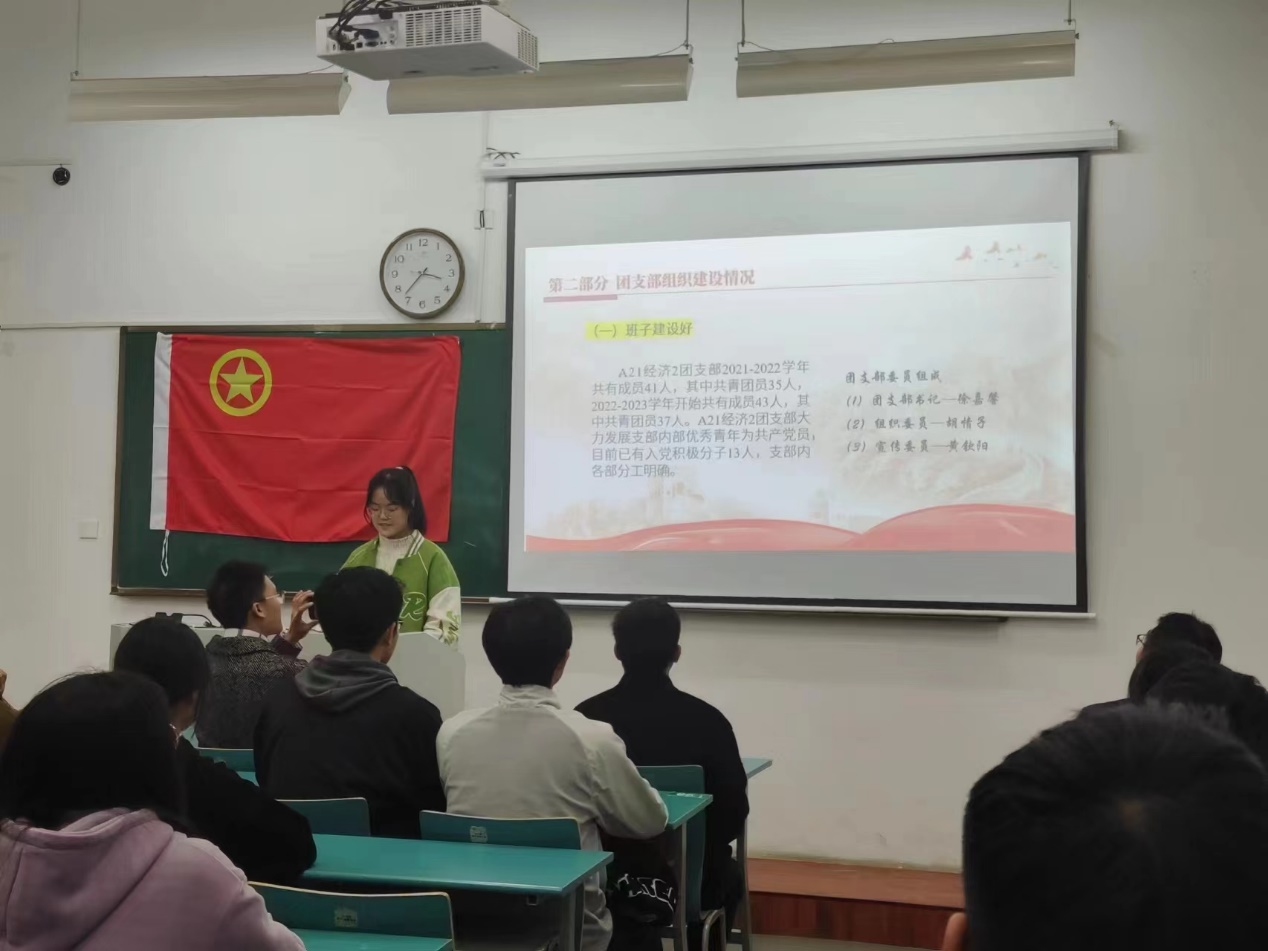 团支书徐嘉馨同学向支部成员汇报了团支部2022年度的工作情况,通过团支部简介、团支部组织建设情况、团支部风采和团支部荣誉四个方面的内容展示了团支部自成立以来,在学院党委和团委的正确领导下,班主任、辅导员和任课老师的精心指导下取得的丰硕成绩。徐嘉馨特别指出,A21经济2是一个积极向上、团结友爱、勇于挑战的集体,支部分工明确,以着力发展“五好”团支部为目标。同时,为认真推进“学习二十大、永远跟党走、奋进新征程”主题教育实践活动,团支部采取紧扣报告内容系统学、营造宣传氛围广泛学、创新方式灵活积极学和结合工作联系实际学的“四学”模式,引导支部成员深刻领会党的二十大精神的重大意义、丰富内涵、核心要义和实践要求,迅速掀起学习贯彻党的二十大精神热潮。