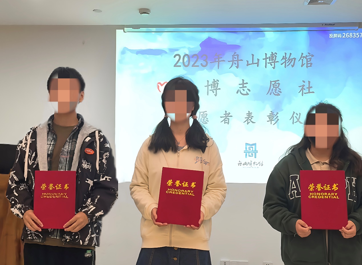 为表彰在2022年度舟山博物馆星光志愿服务中贡献度、参与度高,积极性、主动性强的青年志愿者。2023年4月8日,舟山博物馆于四楼会议厅举办了年度志愿者表彰仪式。其中,黄色网站 李同学、徐同学和马同学荣获舟山博物馆2022年度最佳志愿者,周同学、胡同学、刘同学、汤同学和夏同学荣获舟山博物馆2022年度优秀志愿者。
