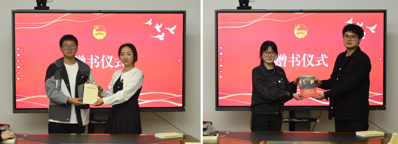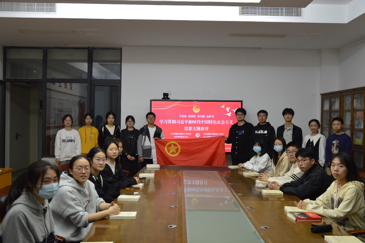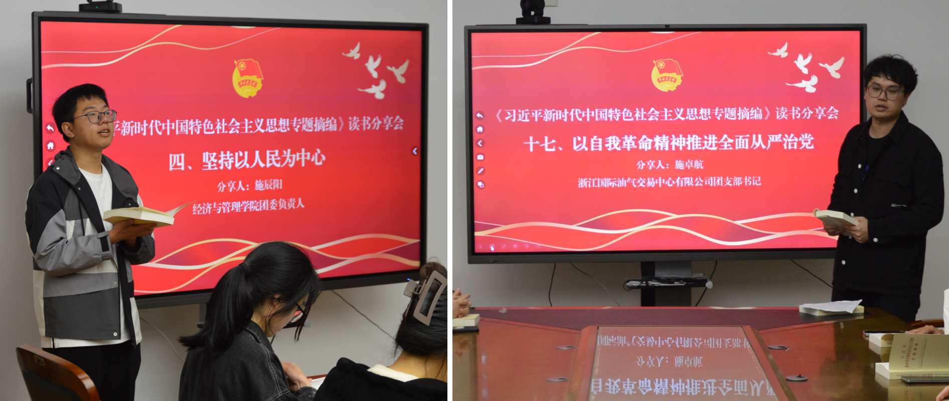 在破冰活动——飞盘竞赛之后,双方的拘谨感和距离感被打破。27日晚上,双方在新城校区文理楼302-1开展学习贯彻习近平新时代中国特色社会主义思想主题教育。首先,双方共同学习了《习近平新时代中国特色社会主义思想专题摘编》。随后,施辰阳老师和施卓航书记分别就《专题摘编》中的“四、坚持以人民为中心”和“十七、以自我革命精神推进全面从严治党”两个章节开展心得分享,号召全体团员青年要勇于自我革命,以人民利益为中心,做挺膺担当的新时代好青年。交流学习过后,双方还开展了赠书活动,施辰阳老师为浙油中心团员代表迟文晶赠送了《论党的自我革命》,施卓航书记为经管学院团员代表罗晨茜赠送了《习近平与大学生朋友们》,活动旨在让阅读成为团员青年的力量源泉,自觉融入到他们的学习和生活当中。本次主题教育和学习交流,进一步加深了团员青年对习近平新时代中国特色社会主义思想科学体系、核心要义、实践要求的认识。