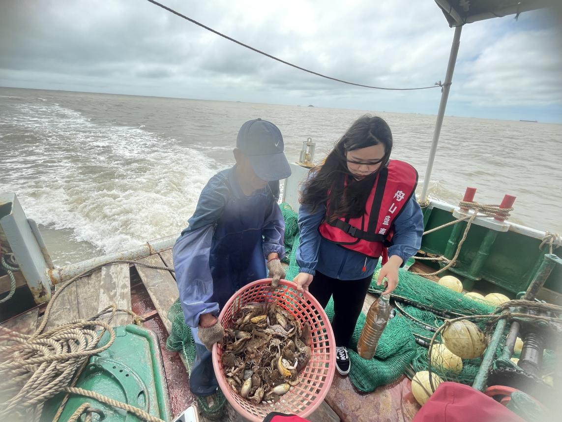 随后志愿者们跟随东海生态共富研习社“东海护鱼”渔民护渔巡逻队随船外出。经过一个小时的颠簸,在船上,志愿者与渔民一起对打捞上来的鱼获和海洋垃圾进行分类,并做好垃圾的记录工作。