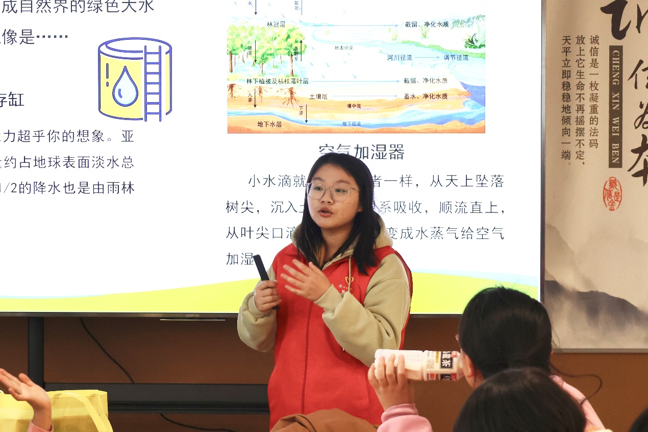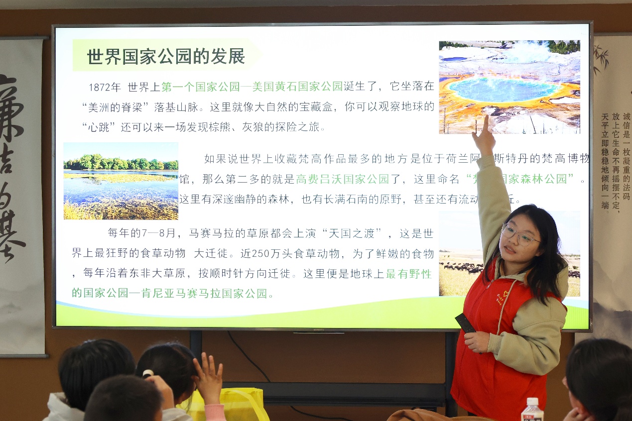 舟山市“红领巾巡讲团”成员、学校“山海之翼”宣讲团成员卢秋羽以《走进国家公园》为题,向小朋友们生动讲述了国家公园的由来、发展以及我国的自然保护成就。她介绍了国家公园作为“绿色瑰宝”的意义,引导孩子们认识热带雨林的独特生态价值。卢秋羽重点介绍了海南热带雨林国家公园,带领大家“云游”这片被誉为“地球宝库”的神奇雨林。她讲述了公园内丰富的生物多样性,包括海南长臂猿、坡鹿等明星动物,以及见血封喉、坡垒等珍稀植物。她还向小朋友们展示了五指山的壮丽景色,并分享了黎苗文化的独特魅力,呼吁大家关注国家公园,珍惜自然资源,争做生态保护的小卫士。