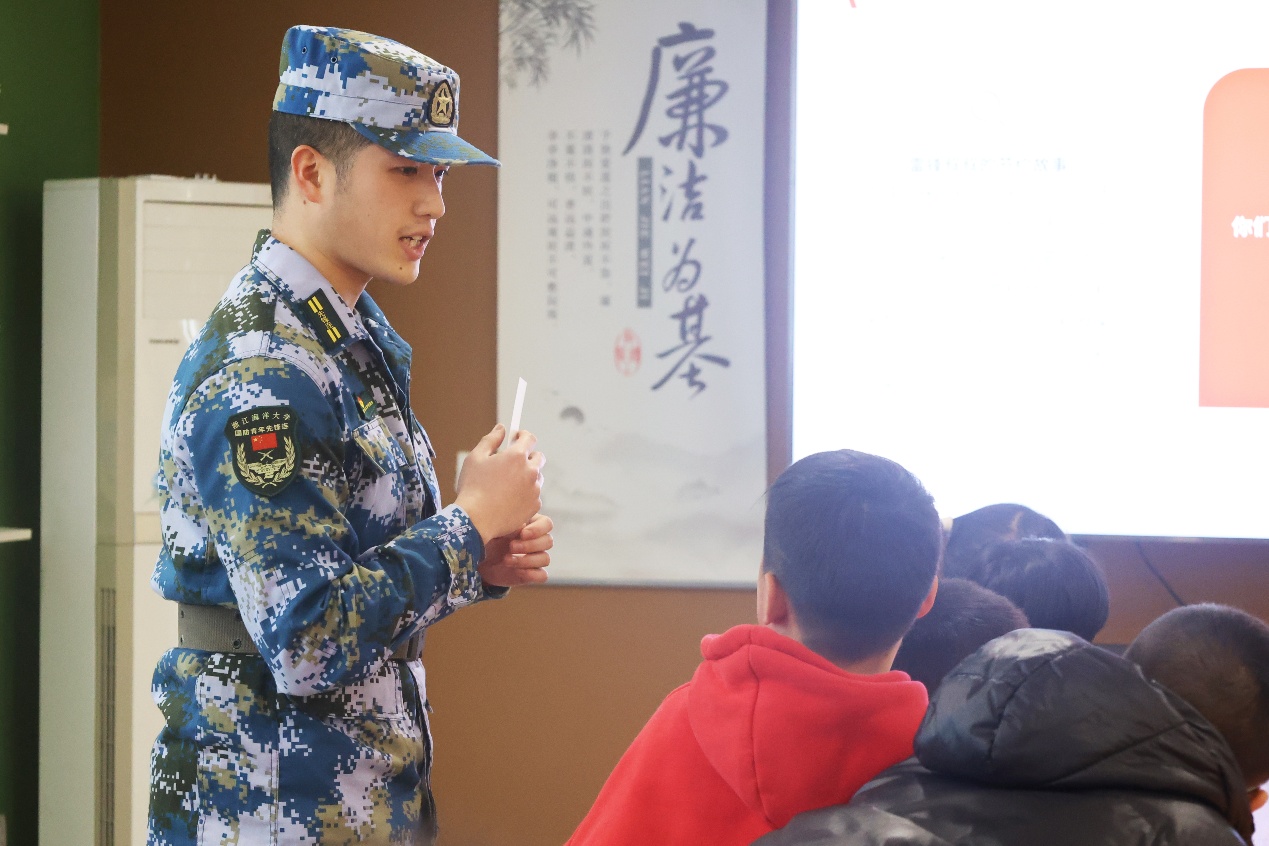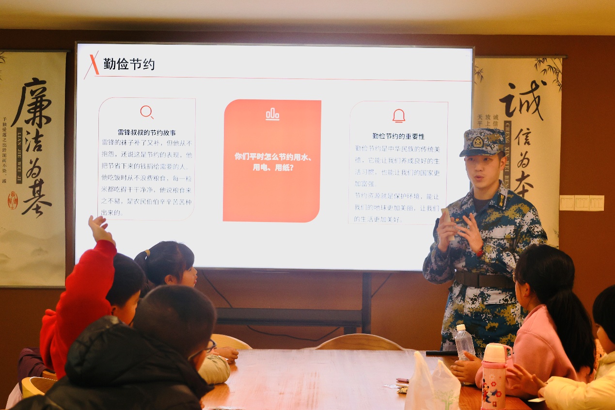 学校“十佳青年志愿者”、学校国防青年先锋连退役大学生陈俊豪以《学习雷锋精神 凝聚青春正能量》为题,饱含深情地向小朋友们讲述了雷锋同志的感人事迹和雷锋精神的深刻内涵。他结合自己在空军服役期间的亲身经历,分享了在军队中学习和践行雷锋精神的点滴故事:在训练中团结友爱、互帮互助,共同完成任务;在疫情期间坚守岗位、无私奉献,始终奋斗在第一线。他还讲述了退役复学后参加亚洲大学生三对三篮球赛开幕式升旗仪式和浙江省迎亚运大型户外展演活动的经历,勉励小朋友们将雷锋精神内化于心、外化于行,用实际行动传递青春正能量。