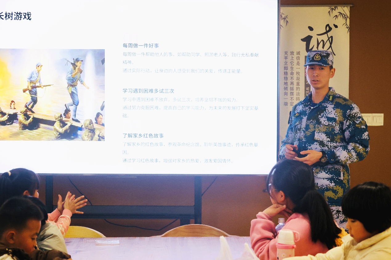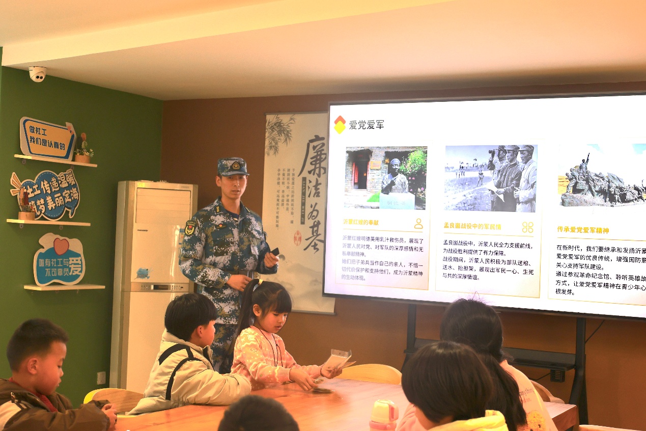 学校国防青年先锋连退役大学生、学校“蒙山沂水,青春对谈”志愿宣讲团成员严镓诚以《弘扬沂蒙精神 争做新时代好少年》为题,深情讲述了沂蒙革命老区的红色故事,带领小朋友们认识了这片英雄辈出的土地。他用生动的语言讲解了沂蒙精神的四个关键词——爱党爱军、开拓奋进、艰苦创业、无私奉献,并分享了沂蒙小英雄的感人事迹:送鸡毛信的“识字班”女孩、为八路军带路的放牛娃,以及新时代坚持学习、拾金不昧的现代小榜样。严镓诚勉励小朋友们每周做一件好事、学习遇到困难时多试三次、主动了解家乡红色故事,在实际行动中传承和弘扬沂蒙精神,争做新时代有担当、有作为的好少年。