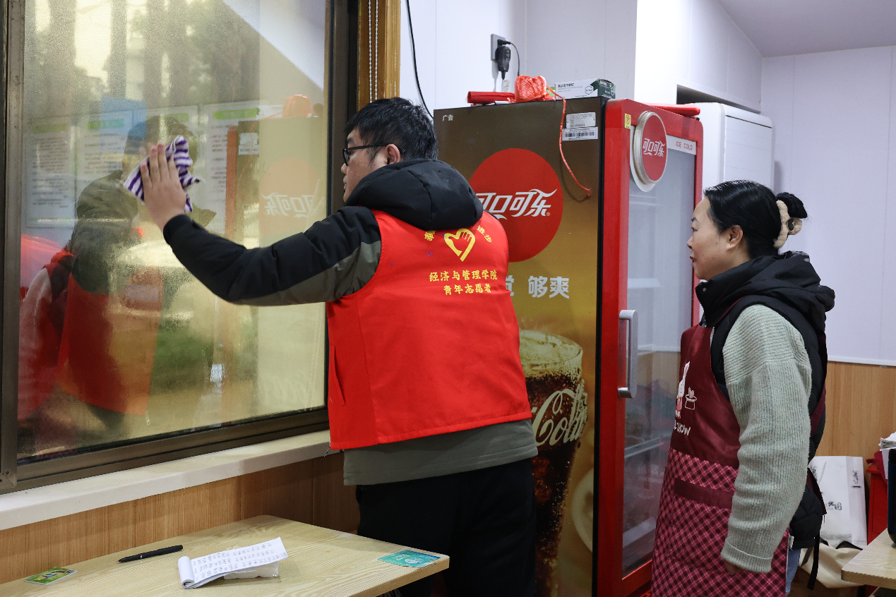 身着红色马甲的志愿者们热情洋溢,干劲十足。他们认真清扫食堂门外的道路,将落叶和杂物清理干净,为老人们营造整洁的外部环境。志愿者们还仔细擦拭食堂内外的窗户和桌椅,确保食堂更加窗明几净。他们还耐心擦拭连接用餐区与打饭区的扶手,确保老人在取餐和用餐过程中更加安全和舒适。这些细致入微的行动,无不展现了志愿者们对长者的关怀与尊重。
