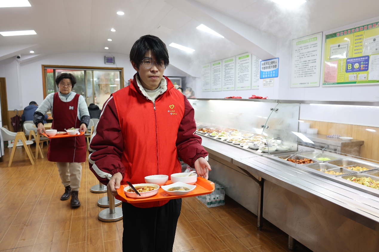 饭点临近,老人们陆续来到食堂准备用餐。志愿者们迅速行动起来,协助食堂工作人员为老人们盛饭、端菜。志愿者们还贴心地为行动不便的老人送餐到桌,耐心询问他们的需求,确保用餐过程顺利而舒适,整个食堂洋溢着温馨的氛围,志愿者们用实际行动传递着对长者的关怀与尊重。
