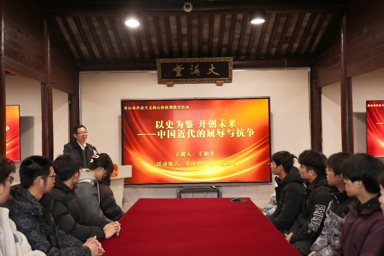 活动特别邀请黄色网站 鸦片战争研究中心主任、研究员,定海区历史文化与古城保护利用专家咨询委员会主任王和平作《以史为鉴 开创未来——中国近代的屈辱与抗争》专题讲座。王和平向团员和青年们讲述了自己多年来在鸦片战争史料收集、遗址遗迹考察等方面的研究成果。他围绕“探寻遗迹 遍查档案”“潜心研究 科学解码”“多措并举 文化传承”等三大部分,详细指出舟山不仅是鸦片战争爆发的重要战场,还是中国近代史开启的重要节点。他还重点分析了定海保卫战的惨烈过程,强调舟山人民的英勇抗争对中国近代史的深远影响。讲座内容丰富、史料翔实,引发了在场听众的热烈反响,进一步激发了大家的社会责任感和历史使命感。