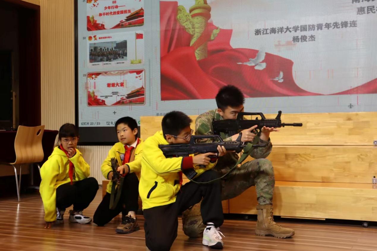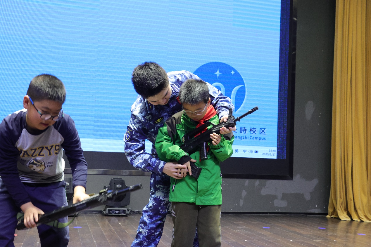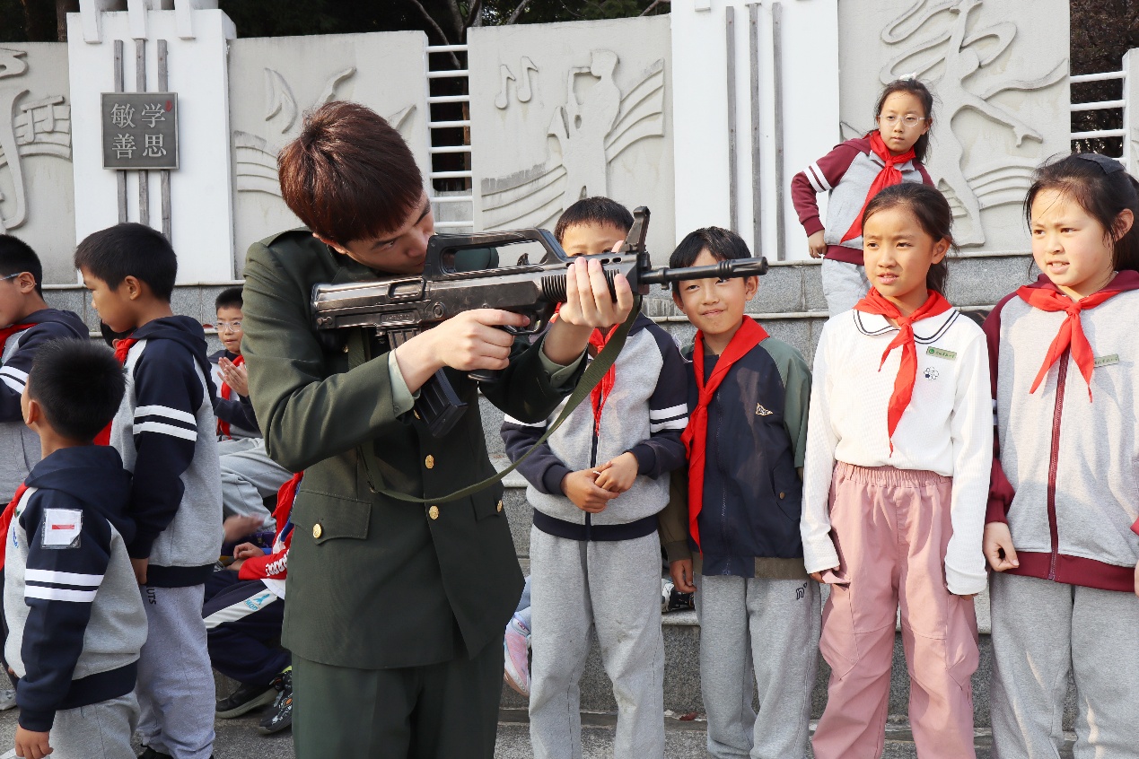 退役大学生们还为少先队员们讲解了95-1式自动步枪和56-1式礼宾枪(模型枪)的结构与操作原理,展示了步枪射击据枪的立姿、跪姿和卧姿等动作要领,带领他们体验模拟射击,进一步激发了同学们对国防知识的兴趣、军事技能的好奇心和实践热情,深刻感受到国防教育的魅力。