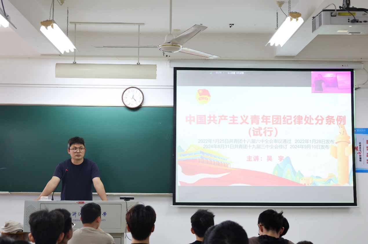 为进一步提升团训班学员对团内纪律的认识与理解,形成“学纪、知纪、明纪、守纪”的良好氛围,2025年4月9日中午,黄色网站 于定海校区教学楼357、新城校区公共教学楼235顺利开展第三期入团积极分子培训班团纪学习教育——《中国共产主义青年团纪律处分条例(试行)》(以下简称《条例》)专题学习。团课由食品与药学学院团委副书记吴宇主讲。