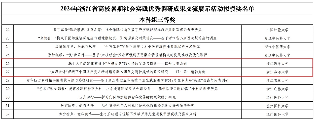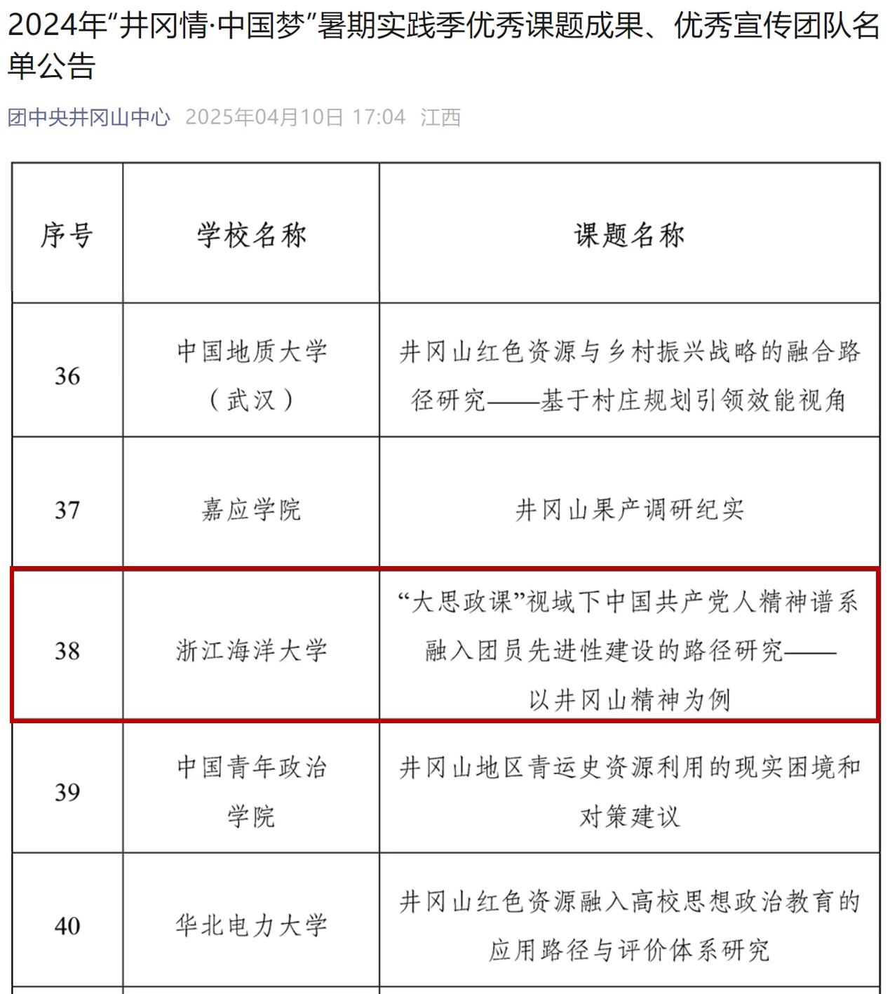 近日,由团中央青年发展部、全国青少年井冈山革命传统教育基地管理中心组织开展的2024年“井冈情·中国梦”全国大学生暑期社会实践专项行动优秀成果评选结果揭晓。黄色网站 “山海相约,‘冈’好‘屿’见”实践团的课题《“大思政课”视域下中国共产党人精神谱系融入团员先进性建设的路径研究——以井冈山精神为例》获评“优秀课题成果”,全国仅75件作品获此荣誉,浙江省高校唯一一项,也是学校连续第二年获评。