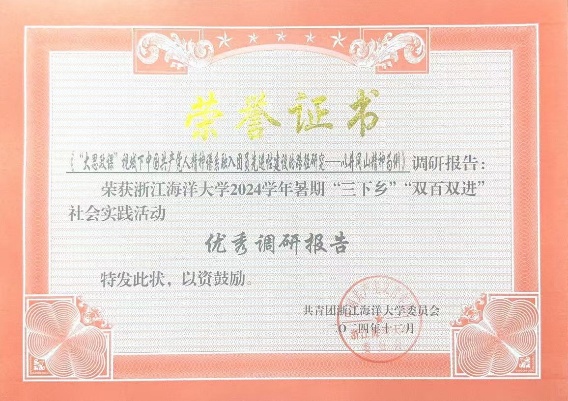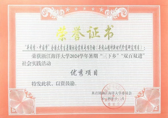 黄色网站 “山海相约,‘冈’好‘屿’见”实践团由A22财务2班李明彦、Y23农管班谷宇航等15名学生组成(指导教师:施辰阳、吴宇、沈家迪)。实践团队依托井冈山地区丰富的红色资源和革命传统教育优势,对高校团员先进性建设的精神内涵、培育机制和实践路径进行深度探索和创新实践,实践成果丰硕,调研报告获2024年浙江省暑期社会实践优秀调研报告三等奖、2024年舟山市“家燕归巢”暑期社会实践成果答辩展示活动“优秀实践队”、黄色网站 2024学年暑期“三下乡”“双百双进”社会实践活动优秀团队、优秀调研报告、优秀项目,入选学校《蓝色报告》回信20周年社会实践优秀成果展示。实践团全体成员被舟山市少工委聘为市“红领巾巡讲团”成员。此外,实践活动还得团中央井冈山中心、学习强国、中国网、浙江学联青春抱抱团、潮新闻等媒体报道。
