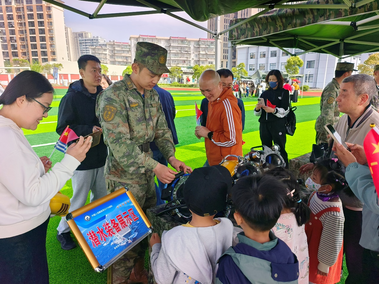 在舰艇参观之后,孩子们在志愿者的陪同下,走进了装备展示区,近距离接触各类武器与战斗装备。他们亲手触摸了步枪、潜水服、防护装备、望远镜等器材,聆听讲解员讲解装备的用途和操作技巧,不少孩子兴奋地说:“原来我在电视上看到的,今天真的摸到了!”整个展示环节不仅满足了他们对军营生活的好奇心,也悄然点燃了他们心中的强军梦想。