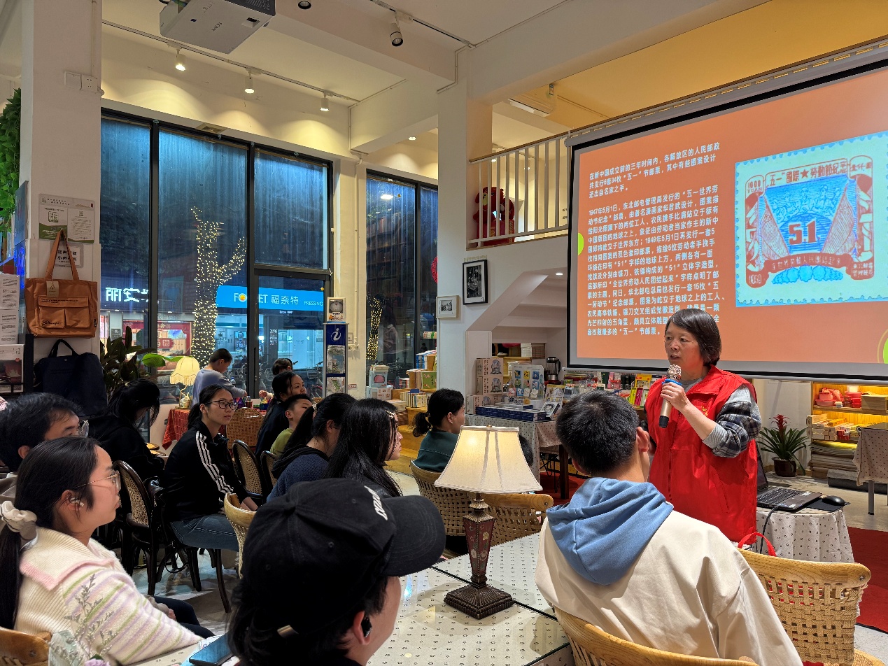 金芳老师指出,我国历年发行的劳动节主题邮票,以丰富的艺术表现形式和厚重的人文历史内涵,生动记录了不同时代劳动者的风采,留下了“五一”国际劳动节鲜明的时代印记。她按照时间脉络,向同学们生动讲述了国内外具有代表性的“五一”劳动节邮票。从1946年5月1日,我国东北旅大解放区与罗马尼亚同日发行的世界首套“五一”邮票,到1964年发行的《全世界无产者联合起来》邮票,再到2009年发行的《国际劳动节120周年》邮票,她生动地讲述了邮票背后的历史故事和社会意义。