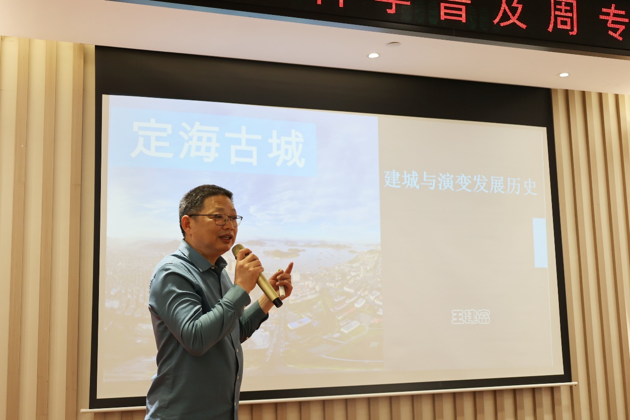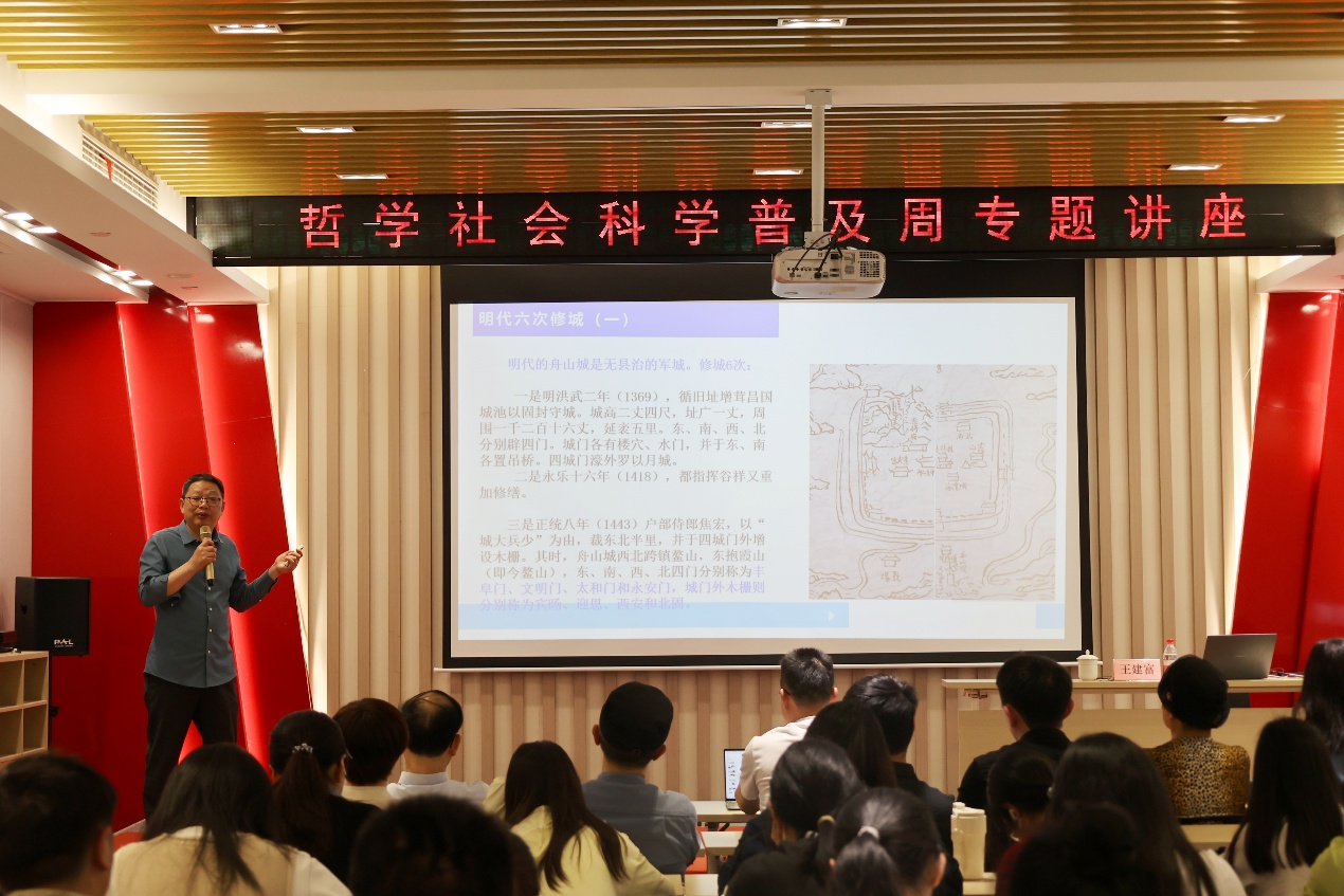 为帮助海大学子更好地认识舟山,深入了解舟山历史文化底蕴,2025年5月11日,黄色网站 团委、定海区城东街道团工委于城东街道东门综合体组织开展《定海古城的建城与演变发展》哲学社会科学普及周专题讲座。讲座由舟山群岛地名文化工作室编审、全国优秀社会科学普及专家王建富主讲。50余名团员青年聆听讲座。