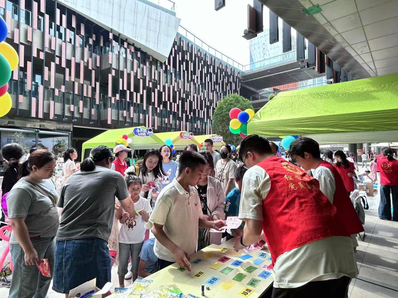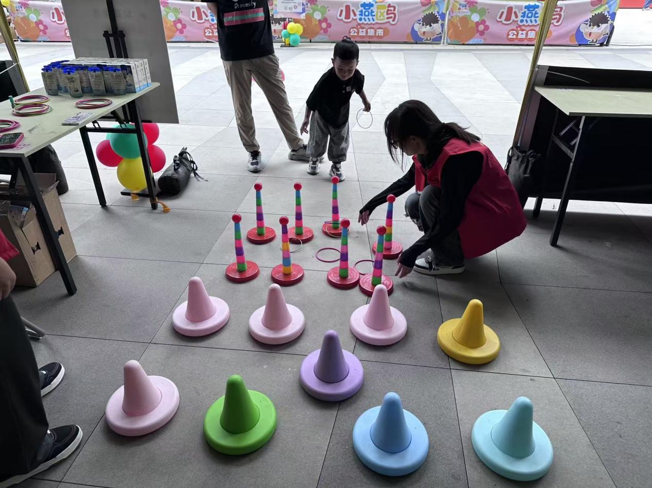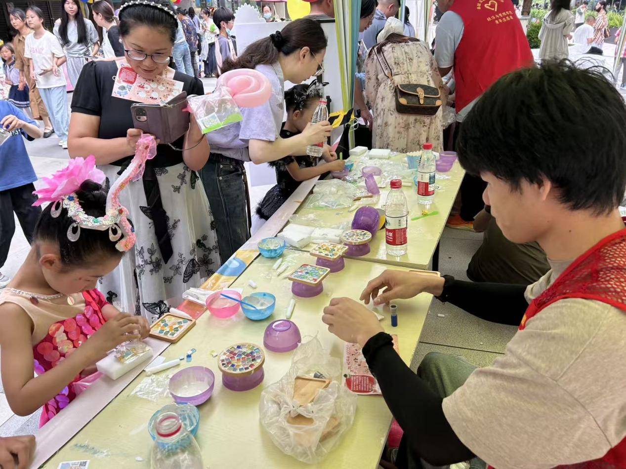 在创意手工区,马赛克DIY摊位前挤满了亲子家庭,志愿者们化身“创意小助手”,耐心指导孩子发挥自己的想象力来创作独一无二的作品。当家长与孩子因意见不同而犹豫时,他们用幽默的话语化解小矛盾,让协作充满温馨。趣味套圈游戏区更是热闹非凡,志愿者们精准记录每一次投掷,即使孩子未能套中,也立刻送上鼓励的集章卡,并用“下次一定行!”的加油声点燃信心。他们的细致服务,让每个孩子都能带着成就感离开摊位。