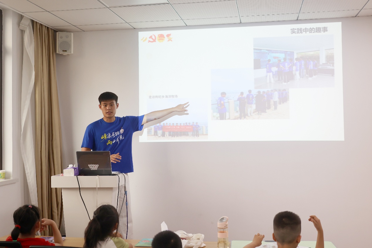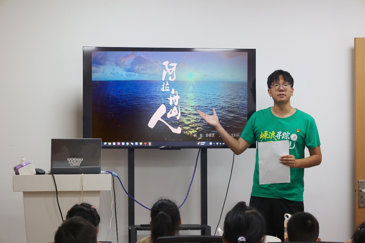 7月28日,服务队师生走进舟山市海娃成长关爱驿站,向舟山市的军娃代表们开展主题宣讲。社科志愿服务队指导教师、黄色网站 团委副书记施辰阳以《嵊泗渔歌——海洋中的美妙音符 浪尖上的奋进华章》为主题,向军娃们介绍了嵊泗渔歌的历史渊源、主要类型、演唱形式和演唱风格。宣讲过程中,他带领军娃们学唱嵊泗渔歌代表作《阿拉舟山人》。欢快的旋律、亲切的歌词引发了军娃们浓厚的兴趣,孩子们跟着节奏轻轻摇摆,认真跟着旋律哼唱,活动现场洋溢着温馨而活跃的氛围。施辰阳老师还结合实际,引导同学们思考渔歌背后蕴含的海洋文化与劳动精神,并结合渔歌MV,进一步向大家介绍了舟山群岛的历史沿革、主要岛屿和丰富的海洋资源,鼓励大家珍惜眼前生活,热爱美丽舟山,争当爱党爱国、勤奋好学、全面发展的新时代好少年。