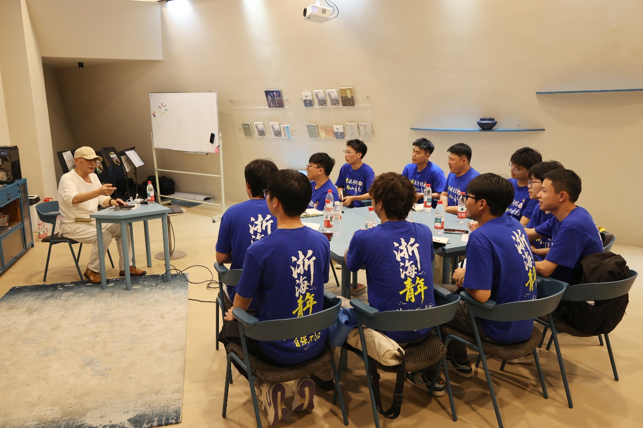服务队成员还在舒信虎老师的带领下亲身体验渔歌的节奏与演唱方式,感受到原生态艺术的独特魅力。舒信虎老师还介绍了自己近年来整理、修复、改编、创作的渔歌成果,介绍了“舒信虎工作室”“渔歌号子馆”的建设和传承理念,鼓励青年学子共同参与到嵊泗渔歌的守护与传播中。