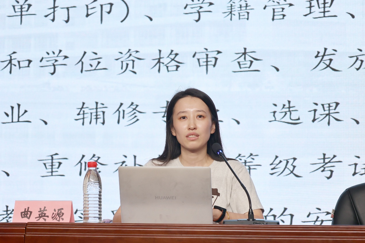 学院教学秘书曲英源向2025级新生介绍了学院教学办的主要职责,讲解了课程安排、选课流程、学籍管理、考试规定及毕业要求等与学习密切相关的内容。她提醒大家要认真规划学业,遵守各项规章制度,遇到问题及时向教学办教师和学习委员咨询,充分利用各类学习资源,不断提升自身综合素质。