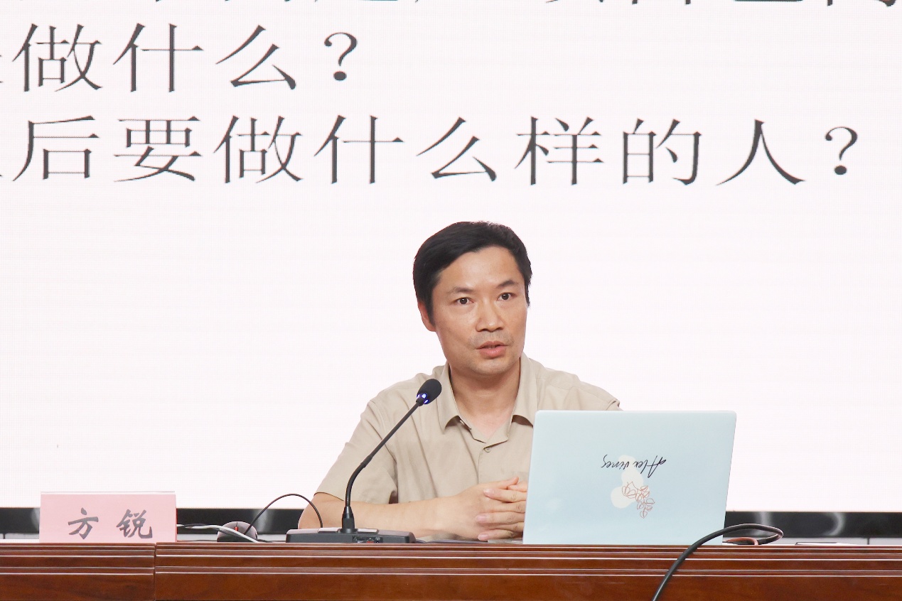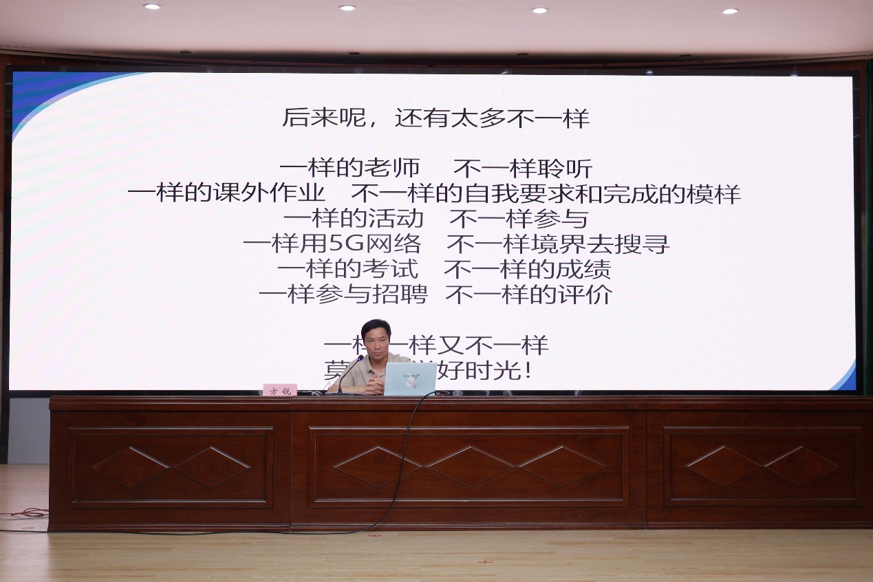 方锐书记总结了读大学存在的没有走出“高考”、“报复性”躺平、“封闭式”圈养、“功利式”应付、“文科无用论”等五大误区,并针对每个误区的成因与危害展开深入剖析,为新生规避成长陷阱、明确发展路径提供了清晰指引。随后,他以湖南医药学院毛克平教授的歌曲《一样一样不一样》为例,勉励新生发掘个人价值,实现全面发展,成长为兼具综合素养与独特优势的海大学子。