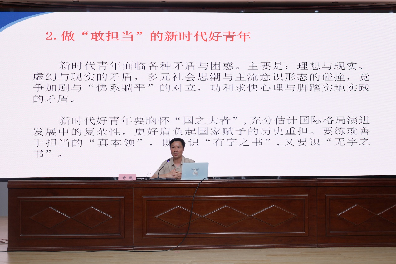 方锐书记以“启航人生新篇章,争做新时代好青年”为主题,从“上大学的目的”“上大学的几个误区”和“争做新时代好青年”等三个方面为同学们授课。他以“为什么要上大学”为切入点,引导新生深入思考上大学的目的,强调每个人的目标有所不同,鼓励同学们明确自己所追求的职业方向与理想生活。他还引用竺可桢校长向浙大学子提出的“两问”,并结合竺可桢奋斗经历,希望同学们树立正确的价值观,在毕业后积极投身社会,为社会发展贡献青春力量。
