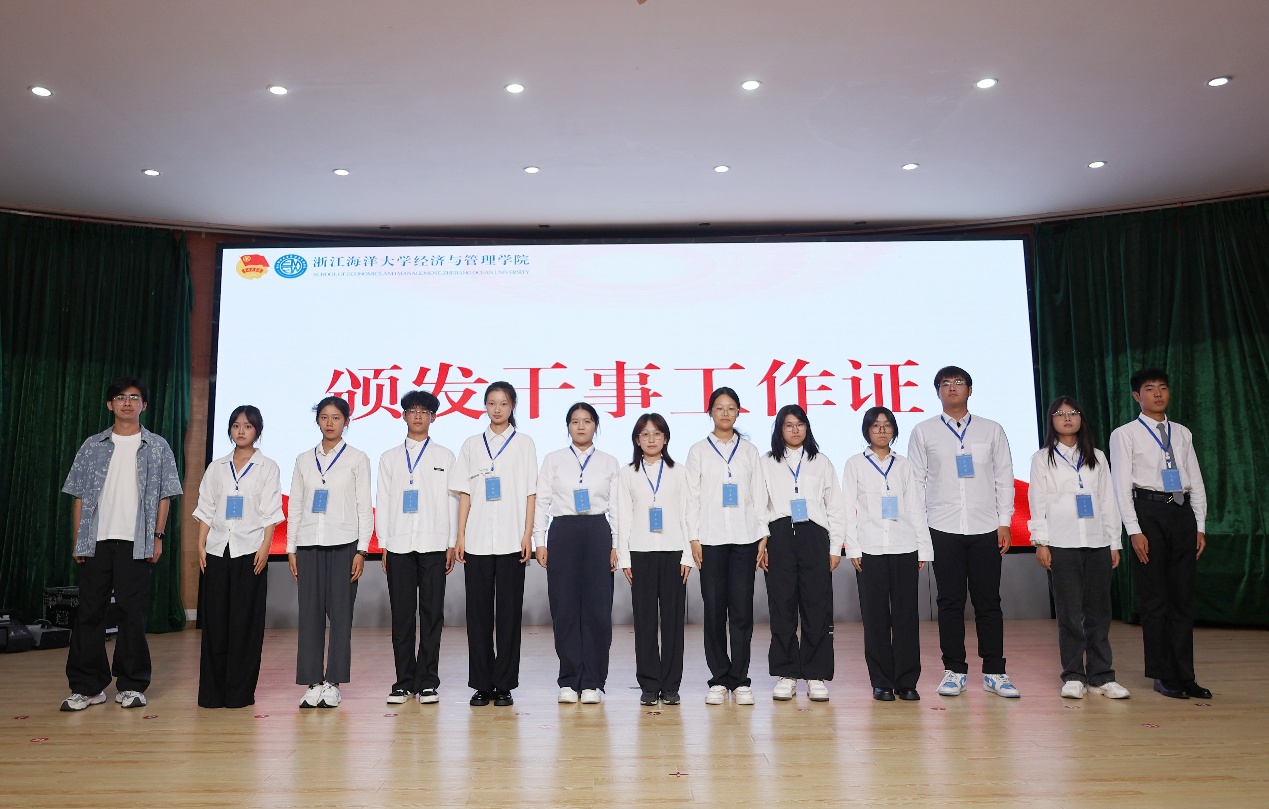 最后,学工办辅导员李泽轩老师为各部门新进干事代表颁发工作证。这不仅象征着干事们正式加入经管团学组织,也激励大家以更加饱满的热情和高度的责任心投入到未来的工作中。