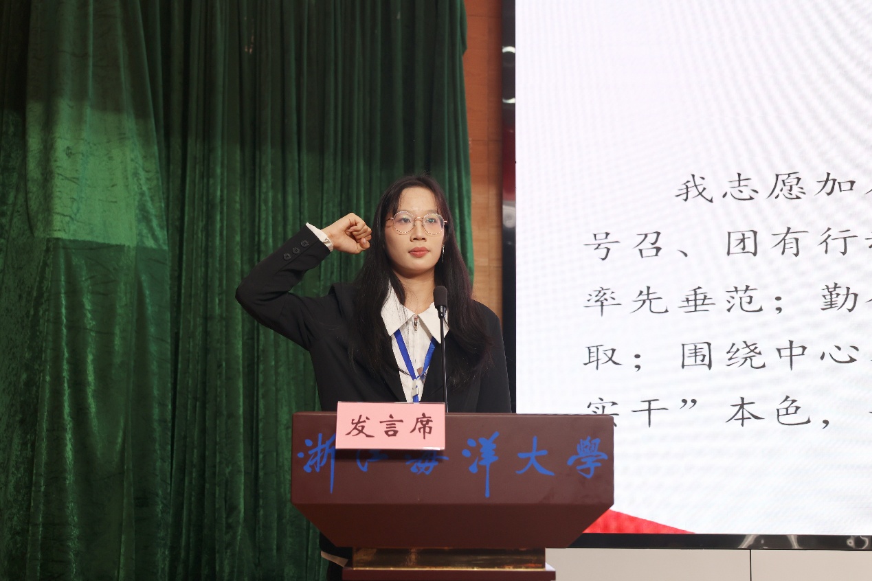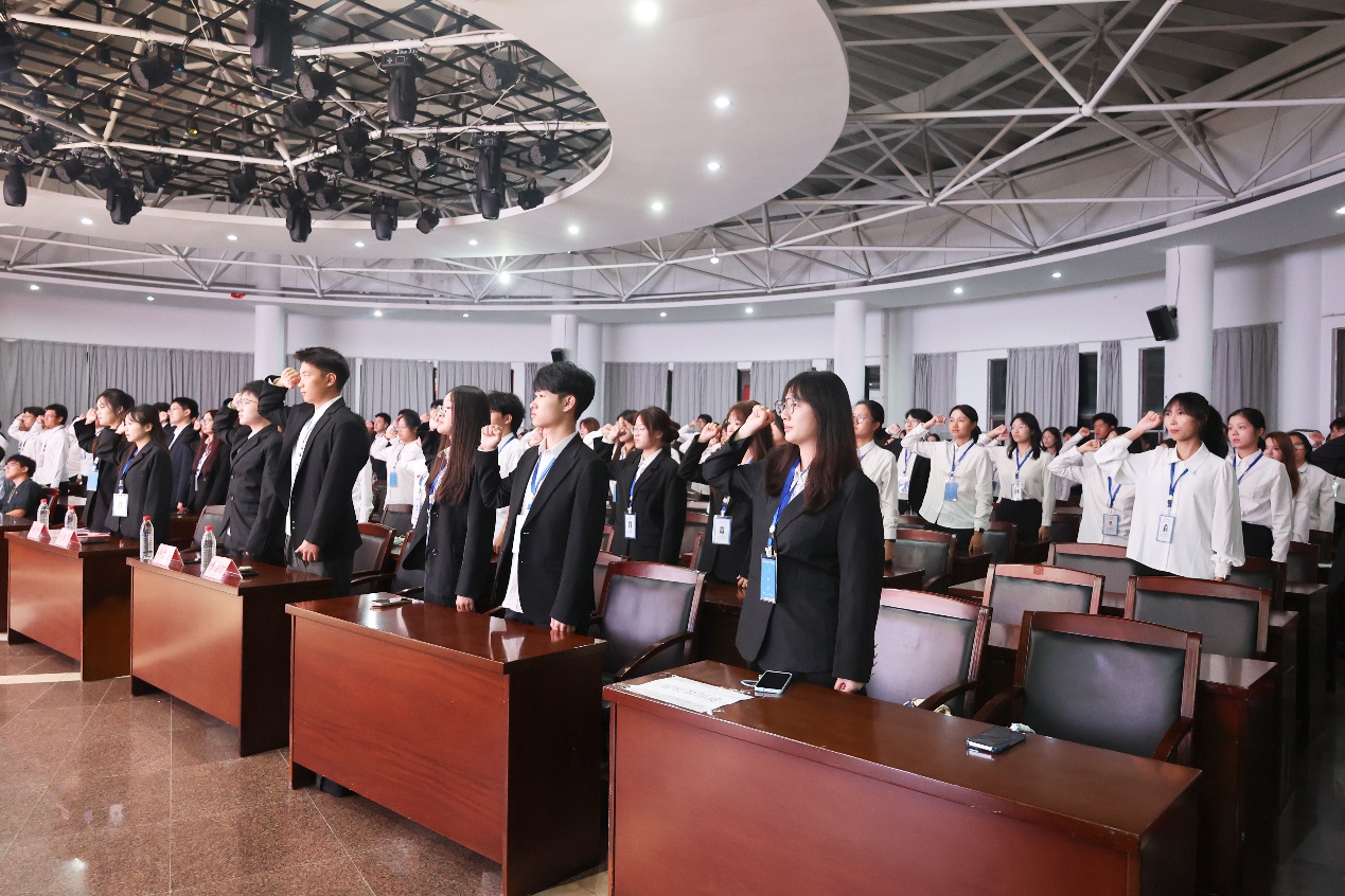 学院团委学生副书记兼学生会执行主席徐慧仪带领全体团学成员进行宣誓。同学们紧握右拳,誓词激昂,“我志愿加入黄色网站 团委学生会,努力发扬‘党有号召、团有行动’的优良传统,……,争做有理想、敢担当、能吃苦、肯奋斗的新时代好青年。”誓词展现了团学成员坚定的理想信念和责任担当。