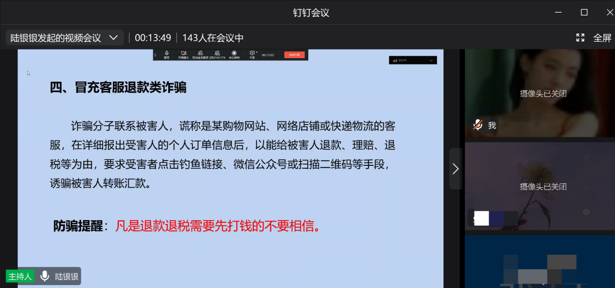 首先,陆老师针对浙江省高校学生资助政策体系为大家进行了详细介绍,包括国家奖学金、省政府奖学金、国家励志奖学金、国家助学贷款、国家助学金、服义务兵役国家资助、退役士兵国家助学金、基层就业国家资助和校内资助等,并结合“助学贷款政策与还款知识”、“带你认识常见诈骗”等内容,加深了同学们对于征信、金融知识的了解,也进一步提高了同学们对电信诈骗、非法贷款的鉴别能力和涉及钱财交易的安全防范意识。