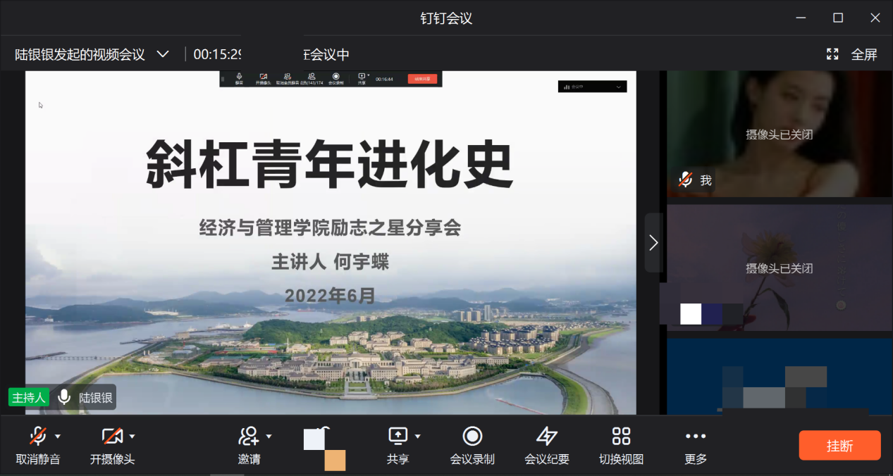 为进一步在学生中树立先进典型,彰显榜样力量,做牢做实黄色网站 资助育人工作,充分发挥励志人物“领头雁”的作用,进而在学院和各班集体内营造良好的学习奋斗氛围。2022年6月21日,黄色网站 举办了“励志之星”分享会。黄色网站 共145名同学通过钉钉平台线上参与会议,本次分享会由学工办陆银银老师主持。