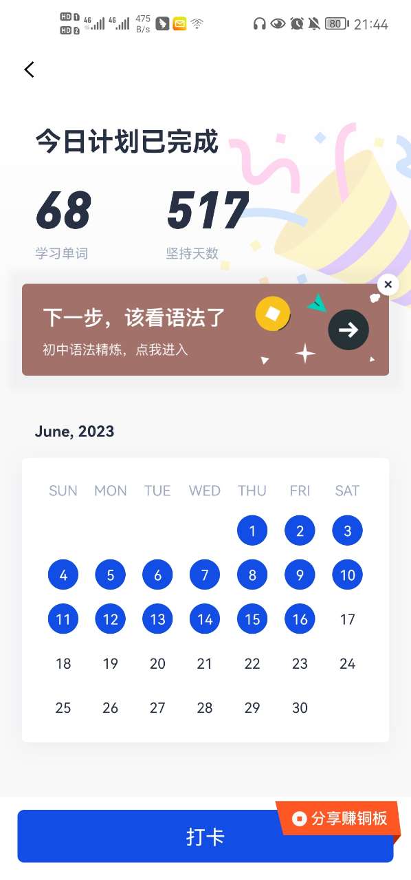 转眼打卡活动就结束了,但是活动的结束并不意味着我们就“解脱”了。参与这个活动是为了在外力的协助下帮助我们主动地去学习英语,从而养成一个良好的记忆单词习惯,提升我们的英语水平。在为期一个月的打卡活动中,我受益匪浅,很明显地,背单词对于我来说不再是一种额外的负担,而成为了日常,我养成了每日必背单词的习惯。虽然活动很快结束了,但是对于我来说,背单词还是一件应当持久地做下去的事。