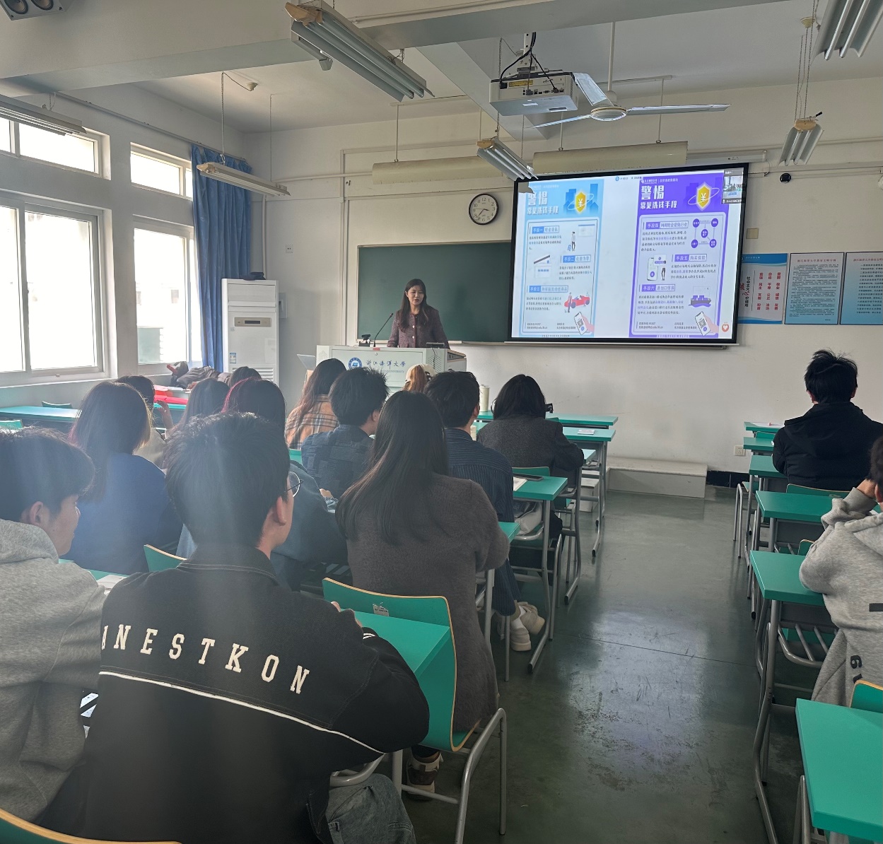 陈老师从六个部分帮助同学们深入了解了理财投资的世界,揭示其中隐藏的风险与机遇,详细解析了常见的理财投资骗局,引导了同学们如何识别看似诱人实则危险的陷阱。陈老师不仅详细分析了有关理财与投资的渠道、风险、如何展开理财的方式以及电信诈骗的形式。她还用具体的实际案例为同学们讲解反诈的相关内容和知识,同时通过有奖问答等互动方式吸引了同学们的兴趣,加深了同学们对理财投资和反诈防骗的认识。